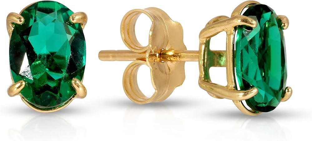 14K Solid Yellow Gold Stud Earrings with Lab. Grown Emerald Grade AAA