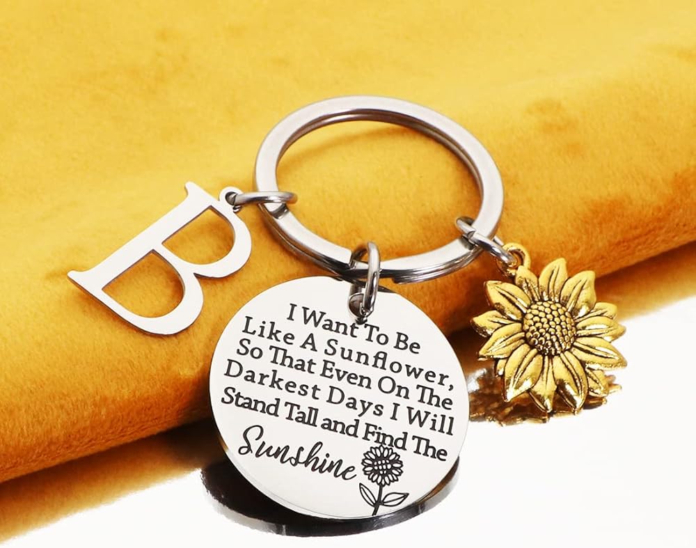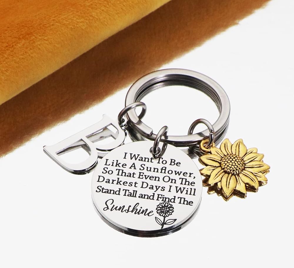 🌻Sunflower Keychain-engraved with "I want to be like a Sunflower so that even on the darkest days i will stand tall and find the sunshine"and sunflower charm and initial.