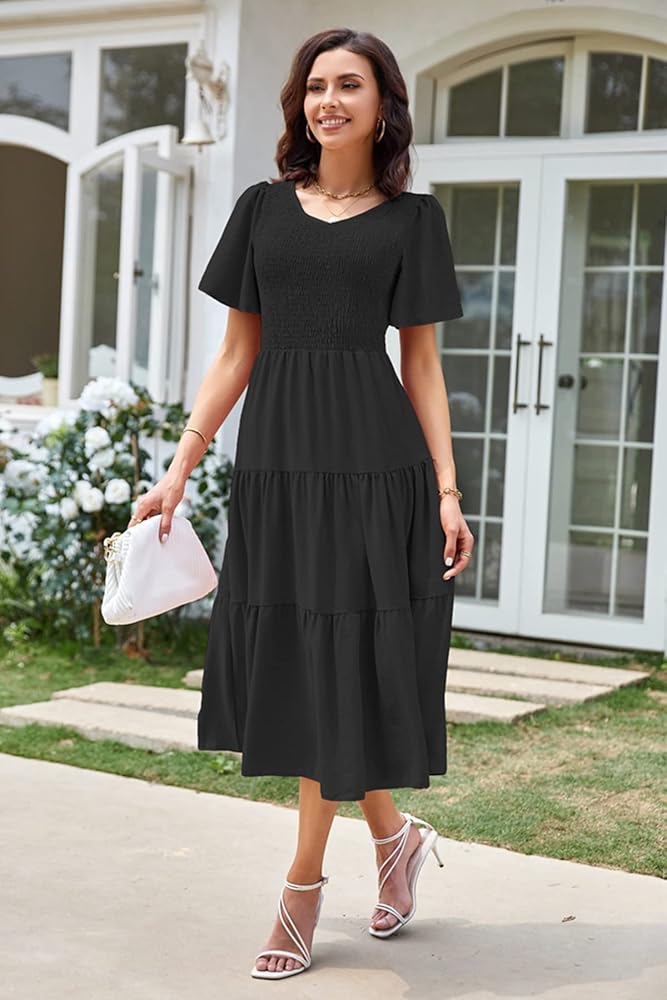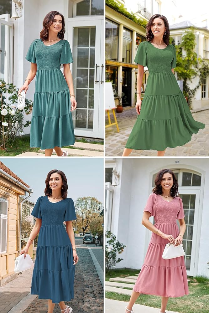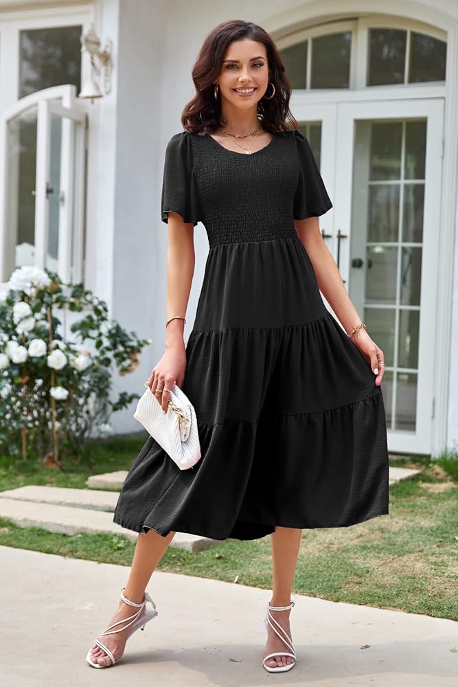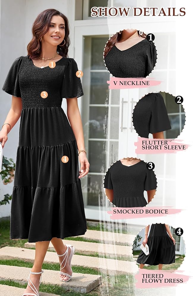 𝑭𝑳𝑨𝑻𝑻𝑬𝑹𝑰𝑵𝑮 𝑨𝑵𝑫 𝑺𝑻𝒀𝑳𝑰𝑺𝑯 𝑫𝑬𝑺𝑰𝑮𝑵: Our v-neck smocked midi dress for women features feminine smocked bodice, flutter short sleeve, stylish tiered dress and excellent summer colors. These unique designs optimize your body proportion to create an elegant, cute and glamorous look for you