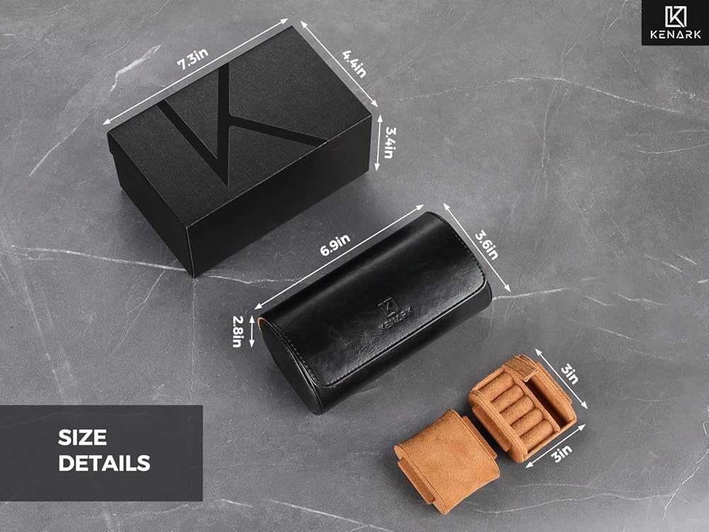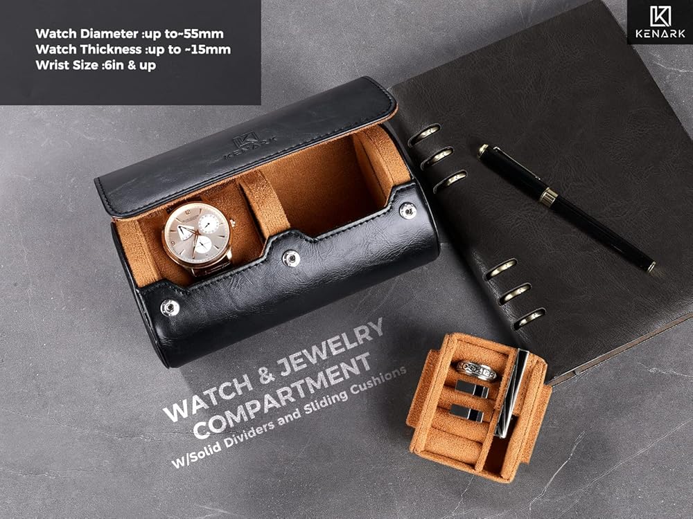 ACCOMMODATES WATCHES AND JEWELRY: The KANARK watch case goes beyond just storing watches; it offers a versatile solution for your precious timepieces and jewelry collection. Featuring a sliding pathway with a soft and cushioned roll, it effortlessly accommodates watches with a diameter of up to 55mm, ensuring their utmost protection and easy access. Moreover, the thoughtfully designed jewelry slot provides a secure space for your rings, cufflinks, and even a tie clip.