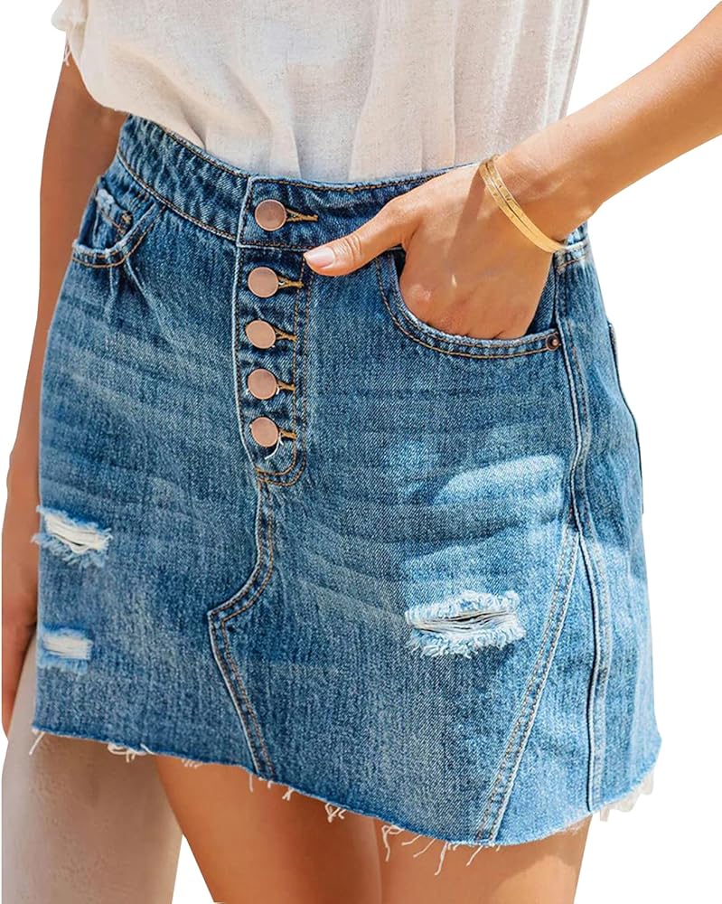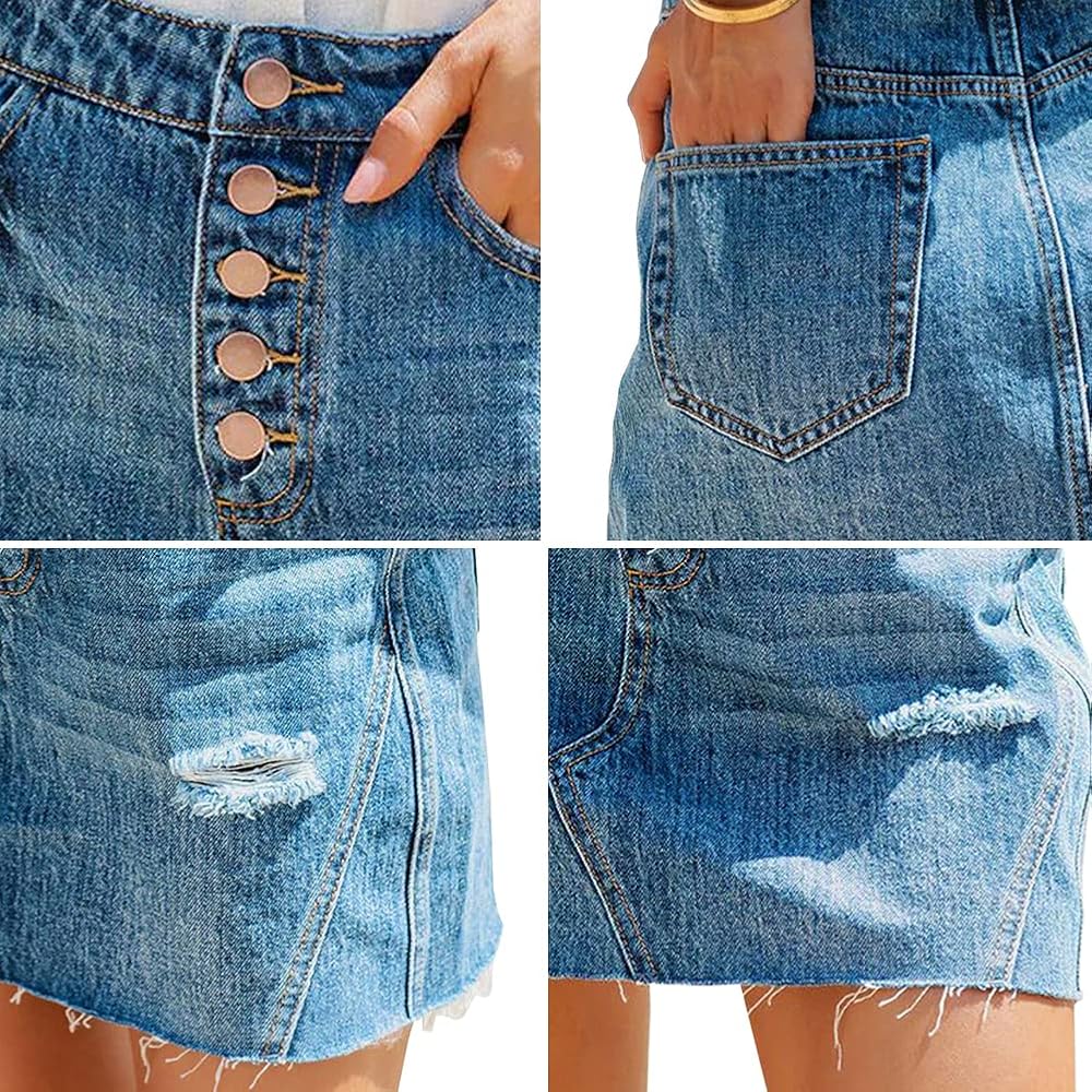 - Denim skirt features with ripped holes, frayed hem, button fly, 5 pockets design are more convenient for covering belongings