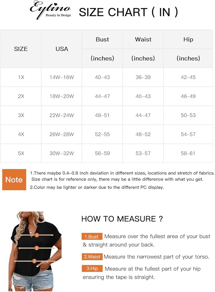 Washing Care: Recommended Machine/Hand Wash with Cold Water/Do Not Bleach/Hang Or Line Dry. Package Content:1 x Plus Size Tops. Please refer to Eytino size chart before ordering(NOT AMAZON SIZE)
