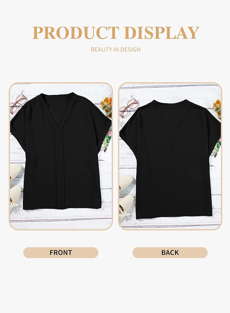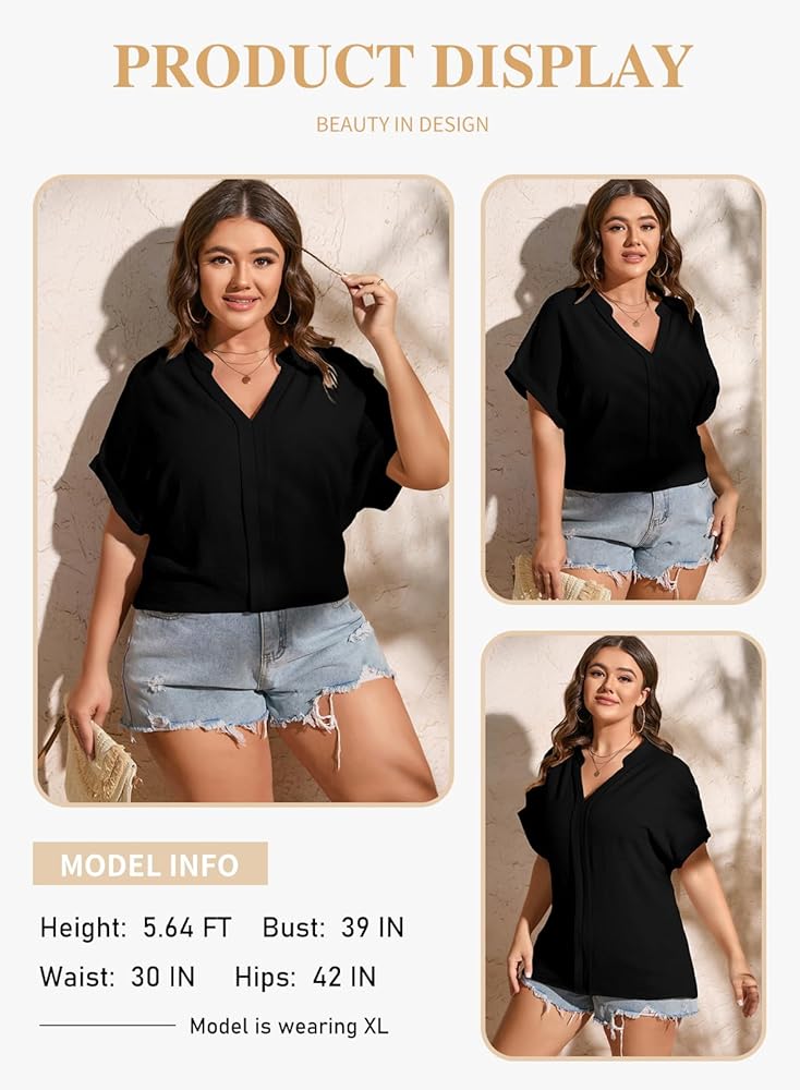 Fashion Design: Womens plus size tops, sexy notched v neck tops, batwing short sleeve shirts, solid color tunic blouse, holiday outfits, dressy casual work clothes, loose style fits for any body shape.