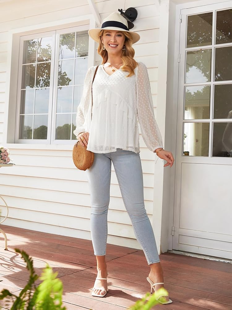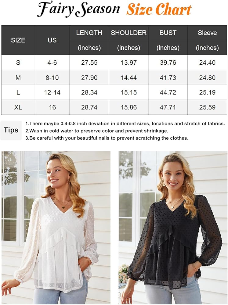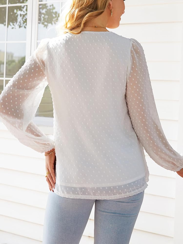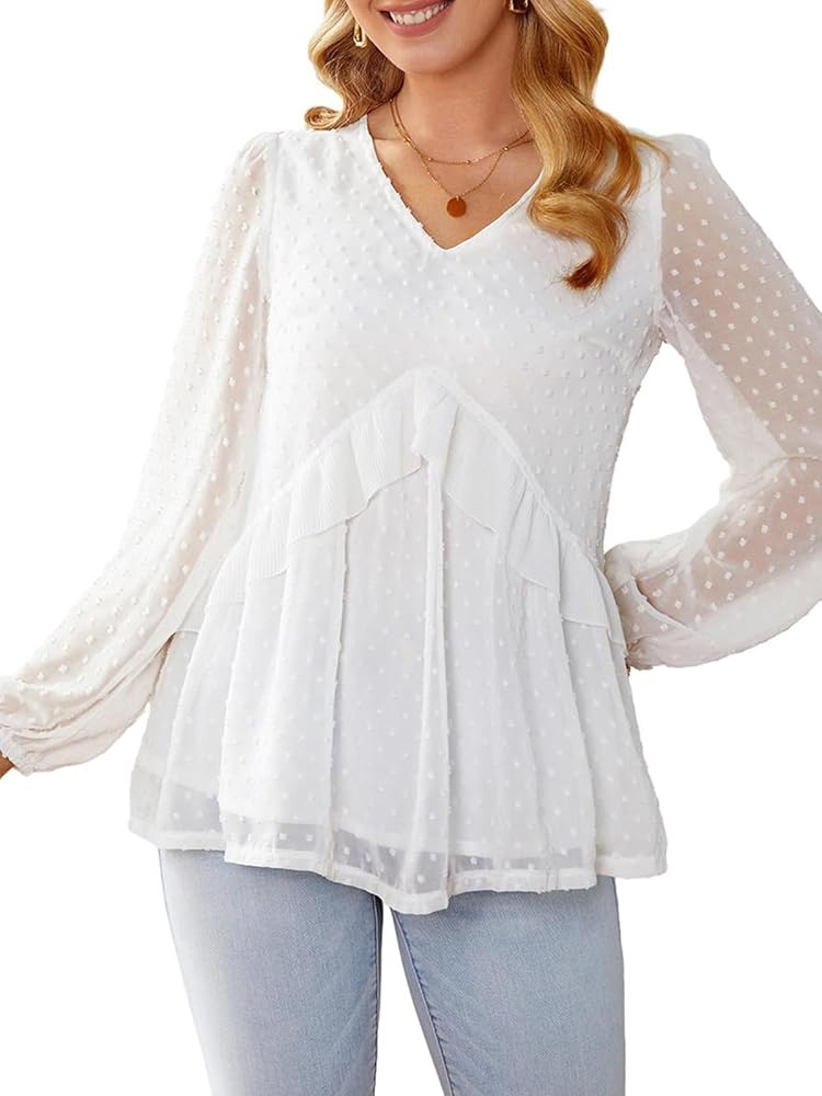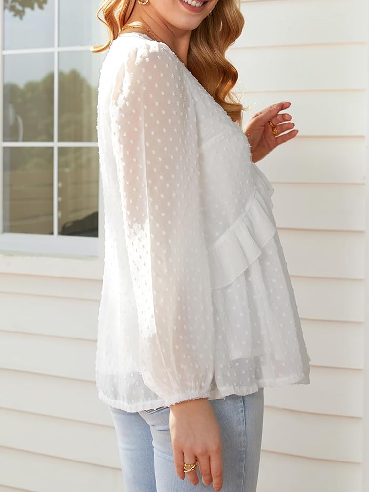 Unique Design: Delicate pleated chiffon lace adorns the front of this women's ruffle top, pretty cute and elegant, while sheer swiss dot puff sleeves perfect for our upper arms and flattering for various body types.