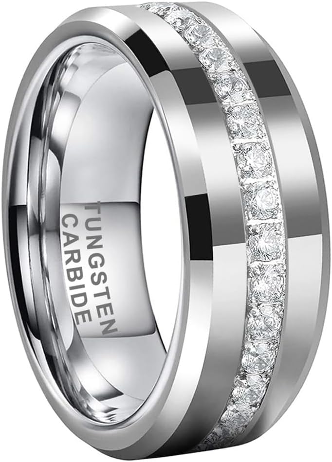 8mm Silver / Black / Gold Tungsten Carbide Rings for Men Women Couple Eternity Anniversary Engagement Wedding Bands Fashion Jewelry CZ Cubic Zirconia Stone All Around Beveled Polished Shiny Comfort Fit.
