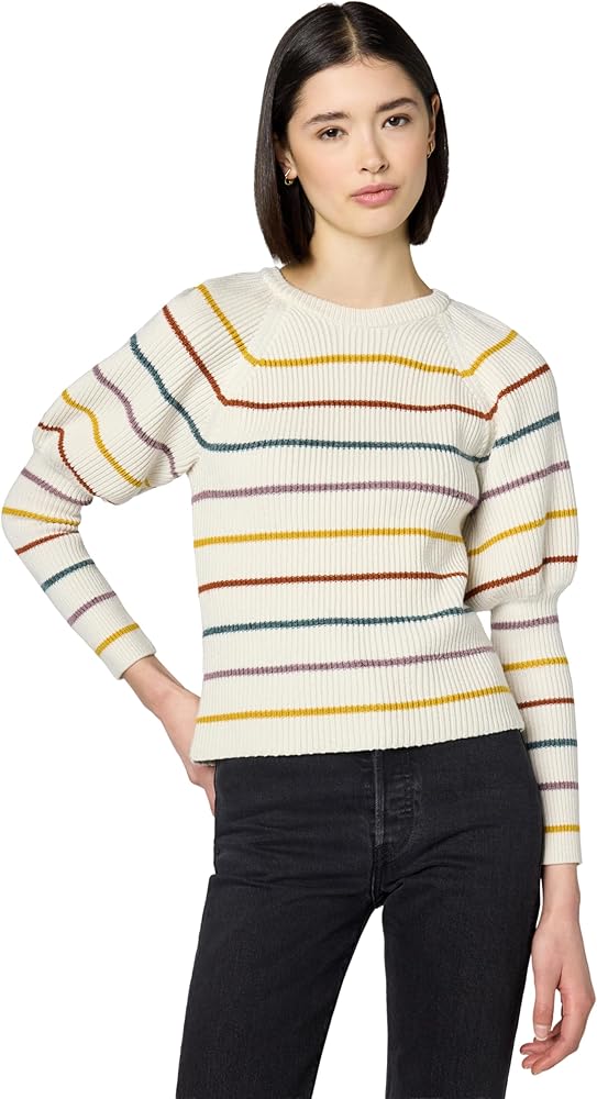 - We love this puff sleeve multi stripe knit sweater by Saylor. Perfect for making a statement and still being cozy.