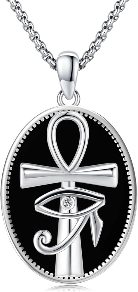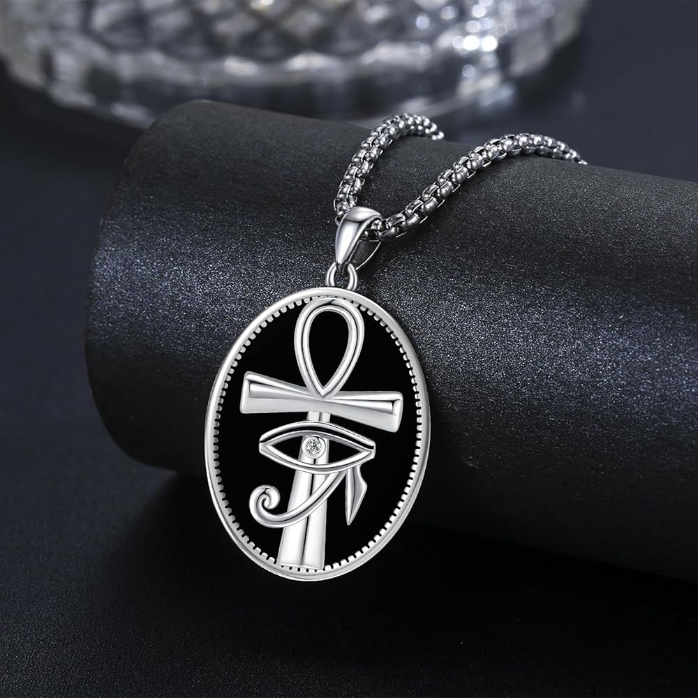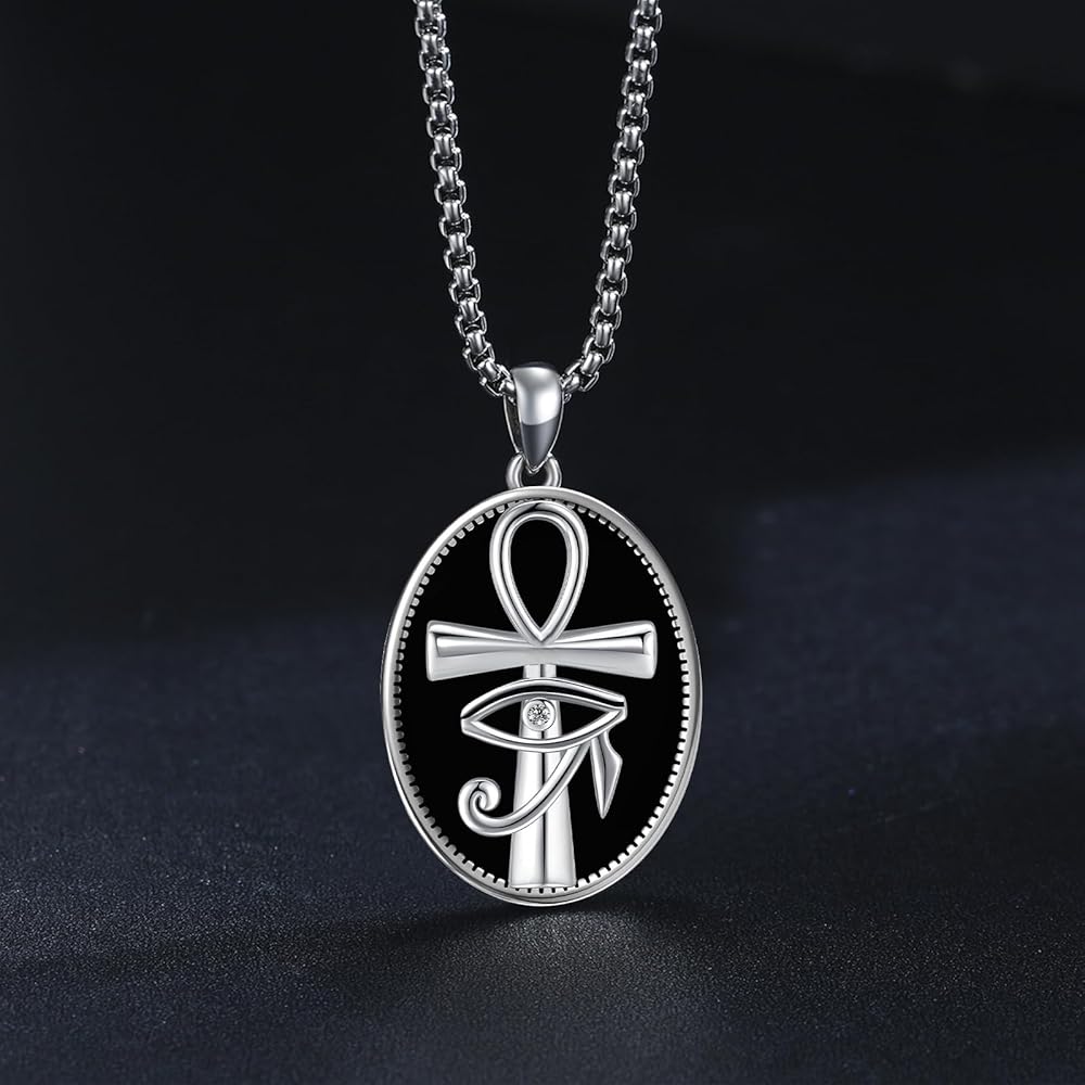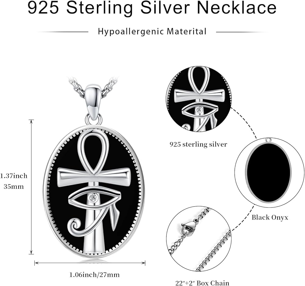 Abalone/Black Onyx/Turquoise/Malachite/Snake Ankh Necklace 925 Sterling Silver Ancient Egyptian Protection Jewelry Eye of Horus Pendant Punk Hip Hop Gifts for Men Women Father