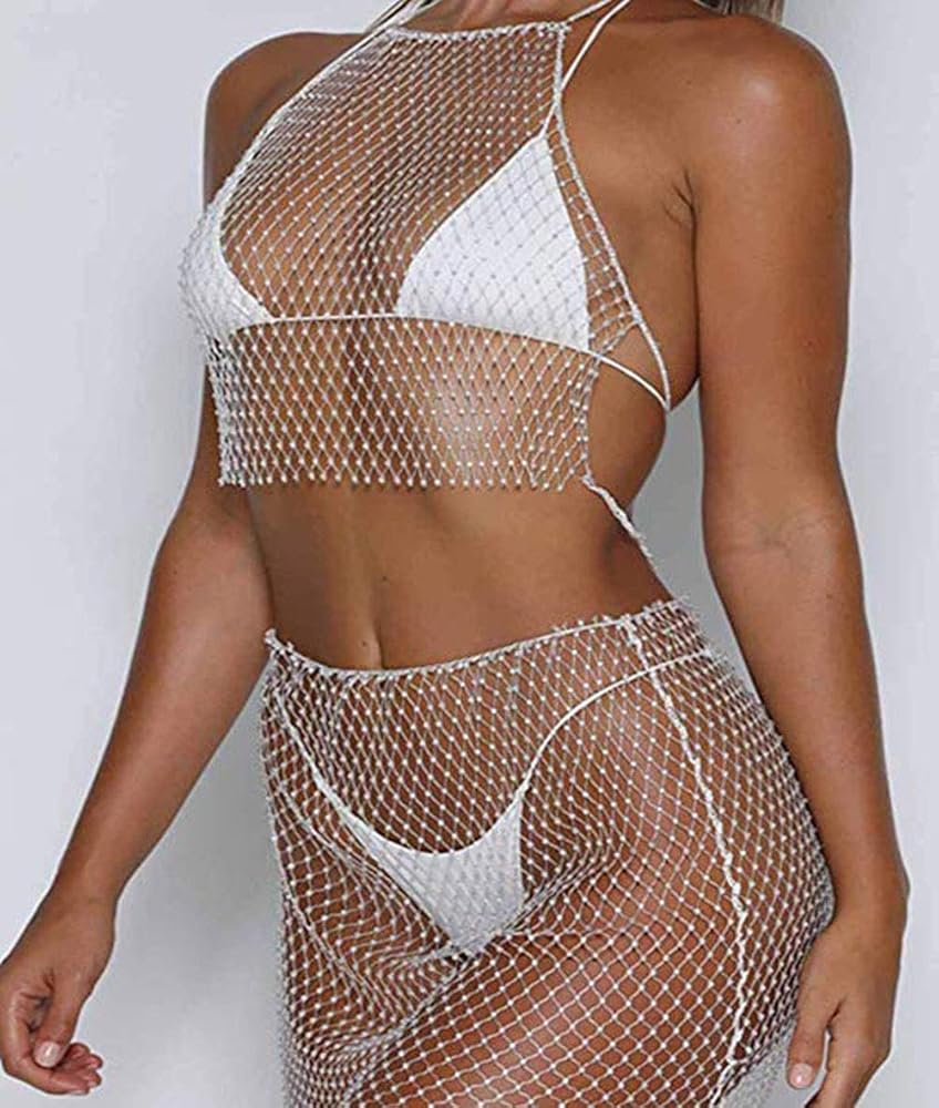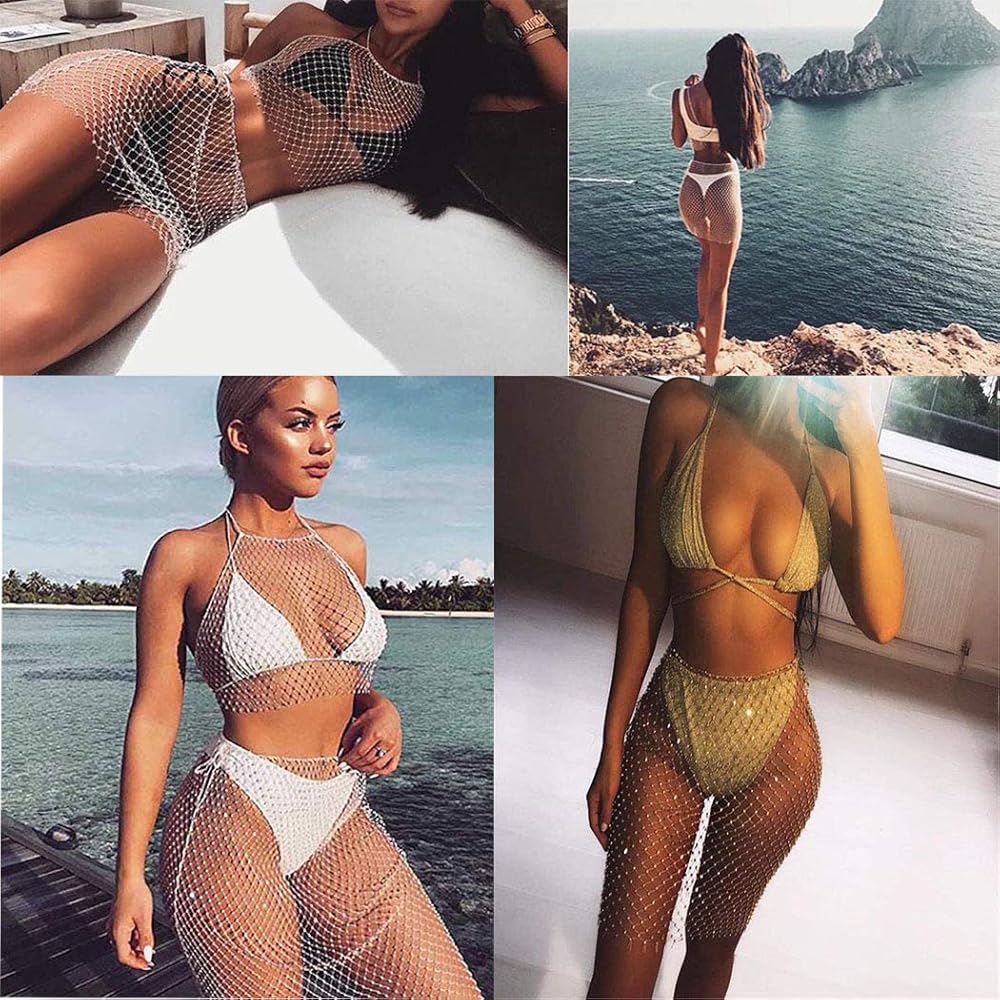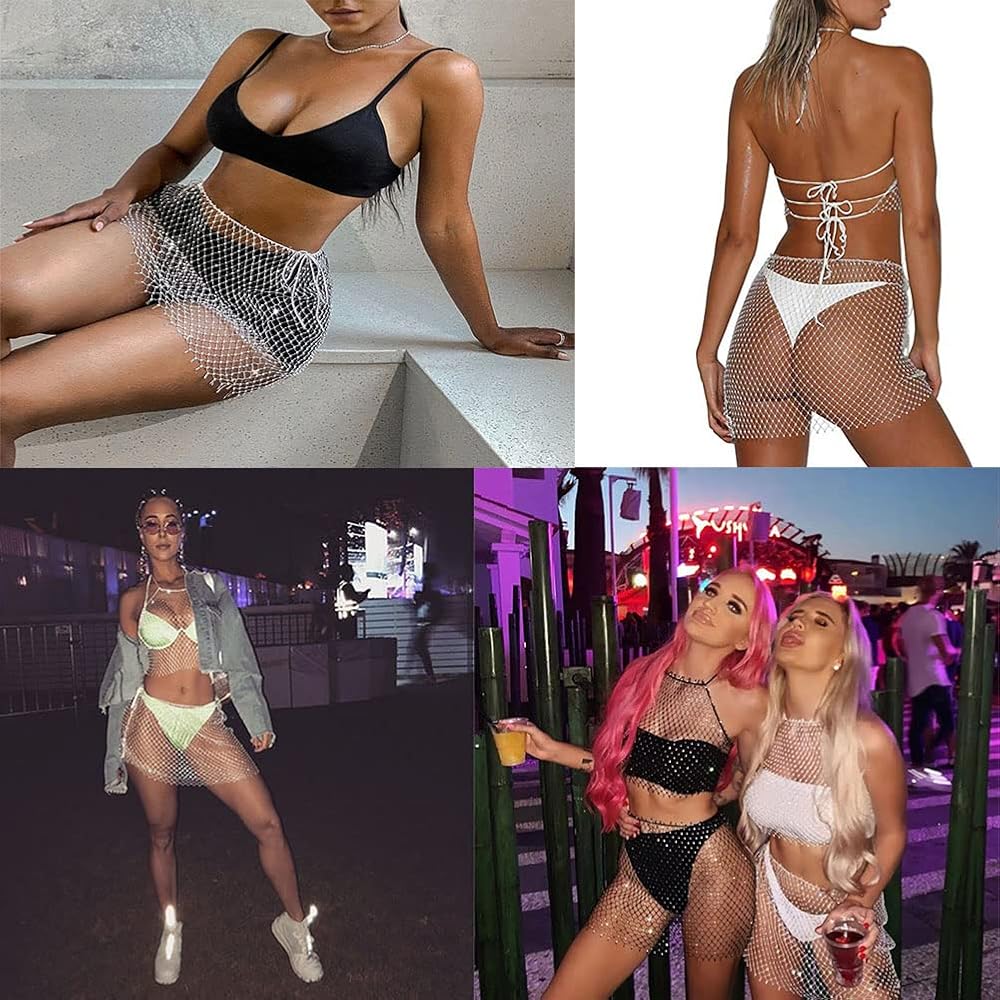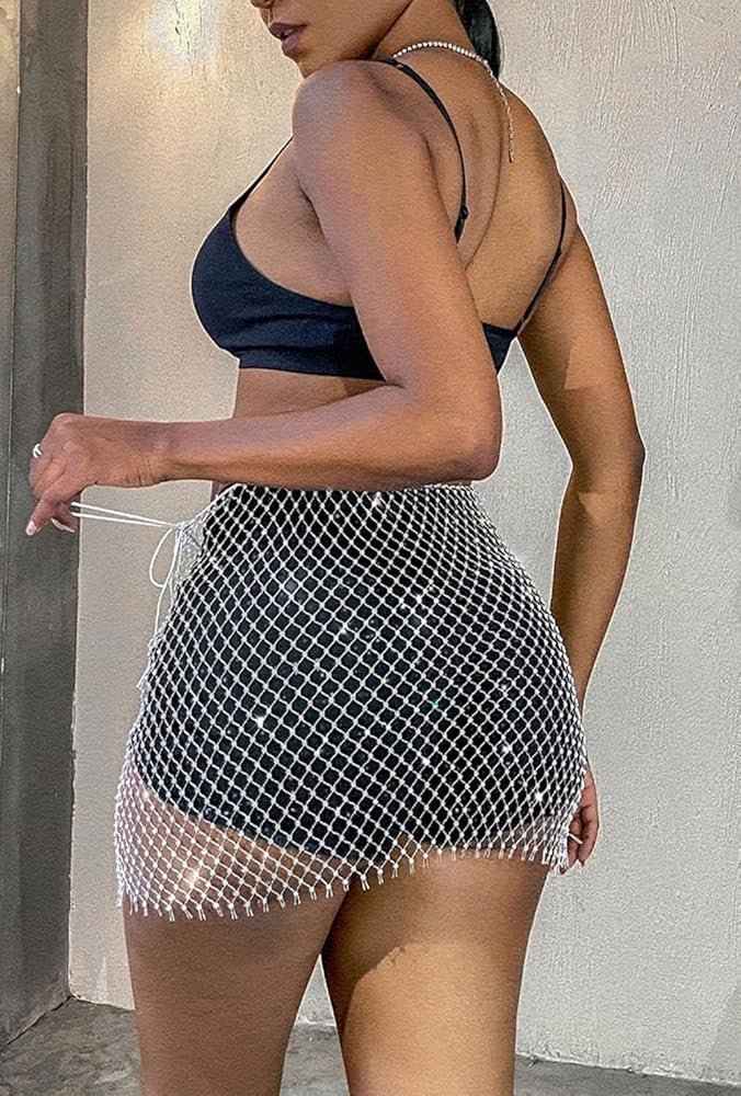 Sparkly Crystal Fishnet Mesh See Through Rhinestone mini skirt Rave Festival Party Summer Beach Clubwear Bikini Swimsuits made of mesh and rhinestone,breathable and Sparkly,above knee short skirts,hollow out net cover up.