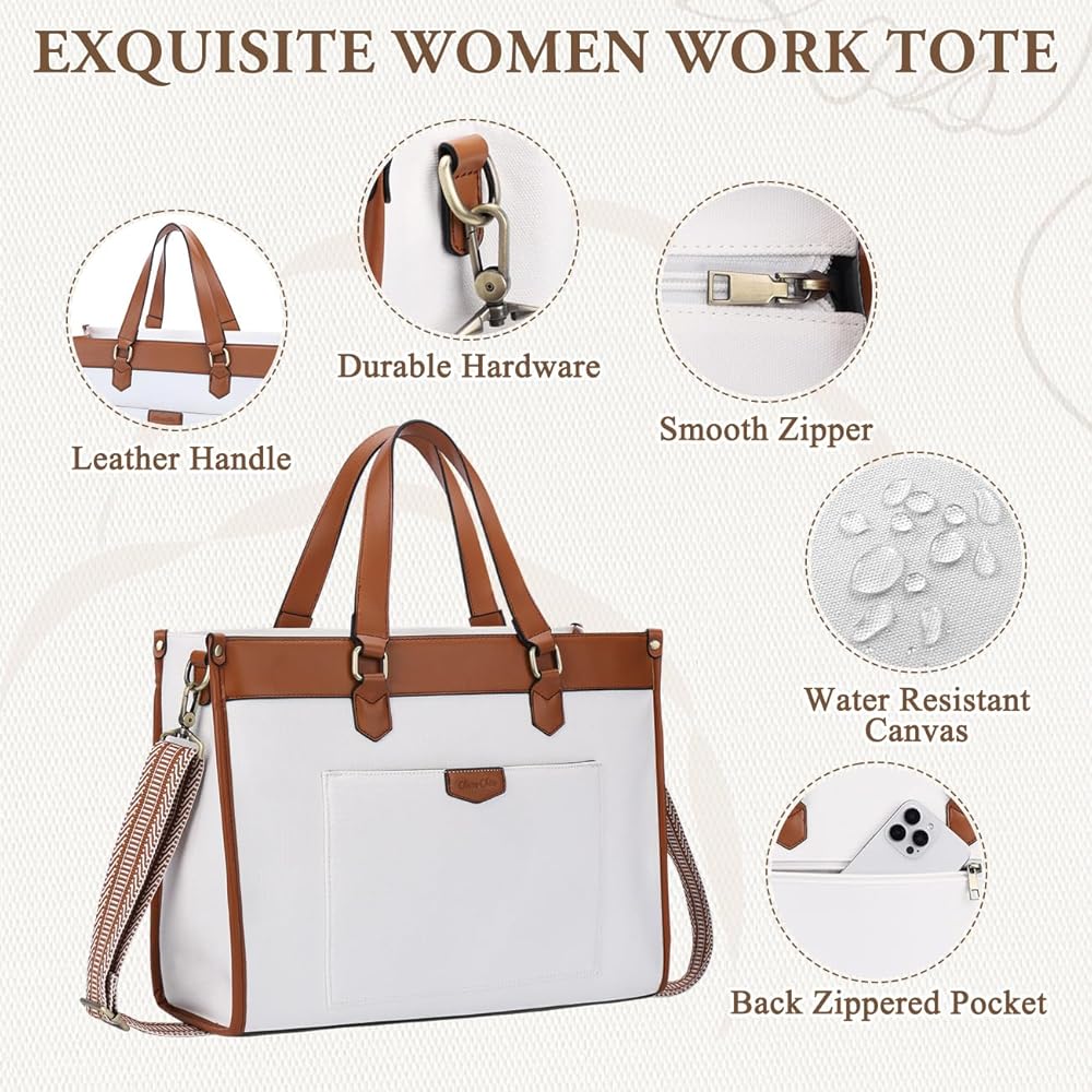 ღCONSIDERARE & CONVERTIBLE:With a canvas body and leather bottom, this women laptop purse is both fashionable and effectively water-resistant.Carry this fashionable briefcase with the adjustable & detachable shoulder strap,you can use it as a shoulder bag or cross-body bag that stays chic through the seasons. The exquisite metal hardware and bottom rivet design also ensure a longer service life.A built-in keychain can help you find keys among many items.