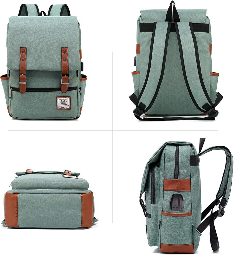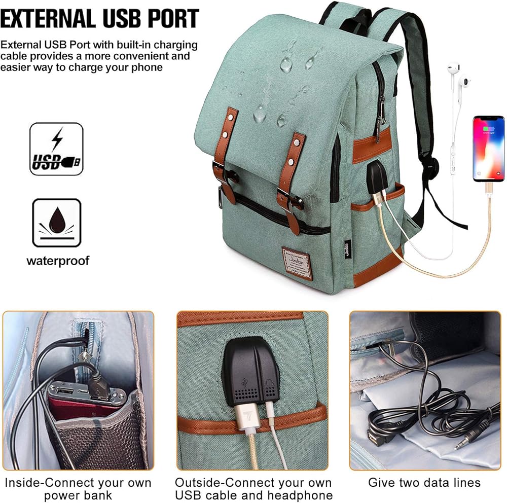 Design: This Vintage backpack with USB Charging Port and Headphone Jack, you can listen to music when you in schooling, outdoor activities, business trip, traveling and keep your electronic product sufficient charge, makes your life more convenient.