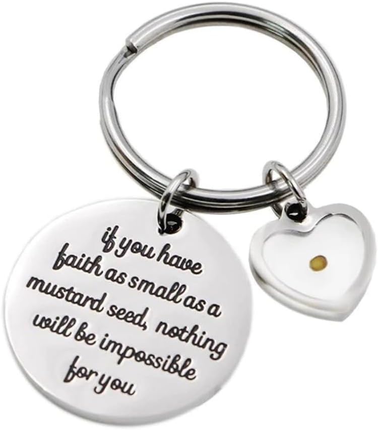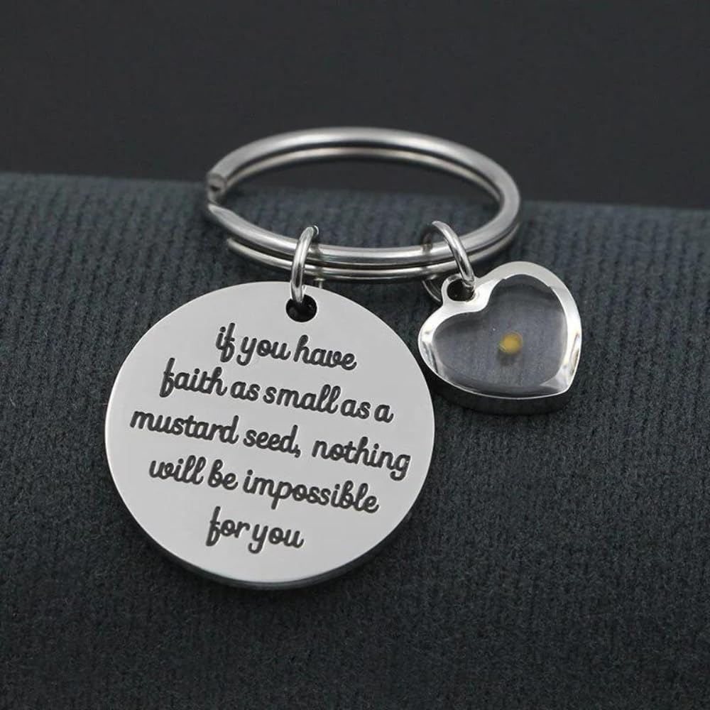 Faith and Inspiration: This key chain features a heart-shaped charm with a real mustard seed inside and a stainless steel pendant engraved with the words “If you have faith as small as a mustard seed, nothing will be impossible for you”.