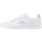 The low-cut trainers ASUKA from Kappa impress in a sporty retro design. It gains sophistication thanks to logo appliqués in trendy material, decorative seams and decorative holes. To improve comfort in the ankle area, the shaft edge is padded. With the help of the lacing, the width of the sports shoe can be adjusted and thus optimally adapted to the foot. The rubber outsole is slightly profiled for a non-slip step. Versatile shoe for everyday use: the retro low cut sneaker ASUKA from Kappa goes perfectly with sports tights and crop top.