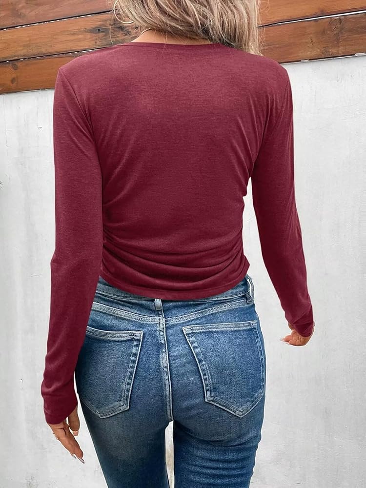 【Dreesy Casual】Womens long sleeve crop tops are never out of fashion. This long sleeve v neck t shirts are featured with ruched desaign, solid color, v neck, shows off your beautiful body curves. Flaunt your confidence and make heads turn wherever you go.