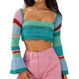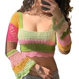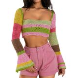 Design: 2022 y2k summer fashion cropped tops,Crochet knitted sweatshirt pullover, square neck color block, long sleeve patchwork, hollow out striped crop top.Perfectly match all kinds of trousers, such as jeans, casual pants, leggings, leather pants,etc.