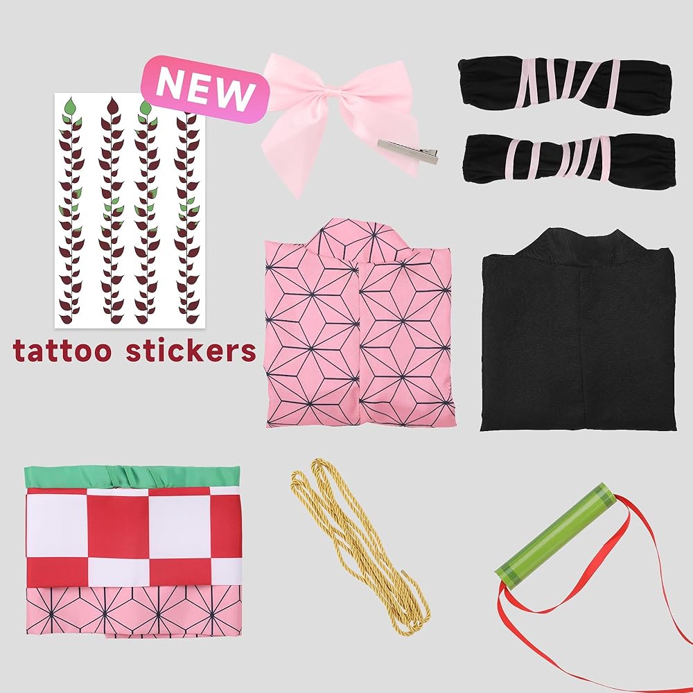 - 🧙♀️Including: Black Kimono-style Jacket*1, Pink Kimono*1, Belt*2, leg bandage*2, Headdress*1, Small Green Tube*1, Stickers*1.
