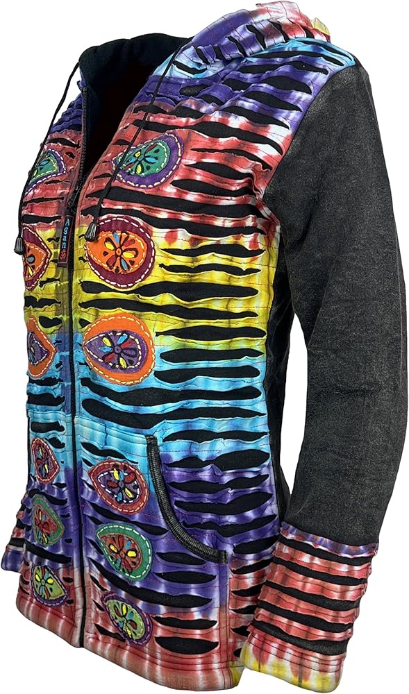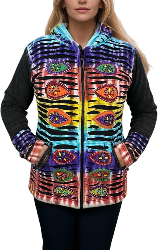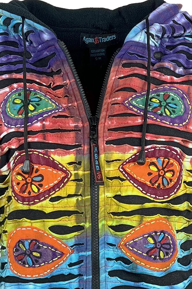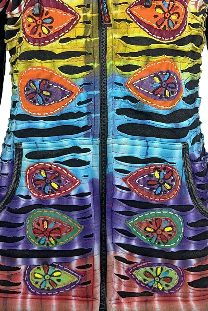 Insulated, Comfortable and Breathable: This jacket is made from soft and breathable knit cotton with fleece lined that features an array of tie-dye patches, blanket stitching, razor cuts, floral embroidered patches embellishment that celebrate the spirit of free-spirited boho fashion.