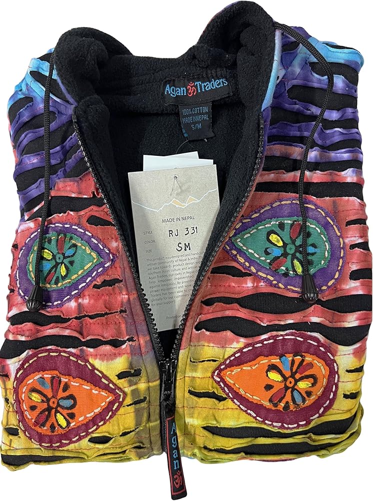Ethically handcrafted: Our jacket is meticulously handcrafted by artisans from the Himalayas in Nepal, reflecting the region's artistic traditions and hippie culture. Please take note that due to the unique patchwork design, color distribution may exhibit slight variance, culminating in each piece being genuinely one of its kind.