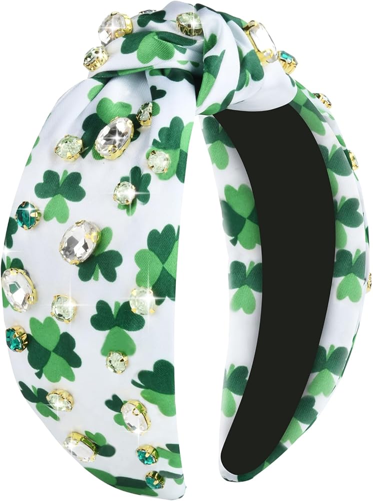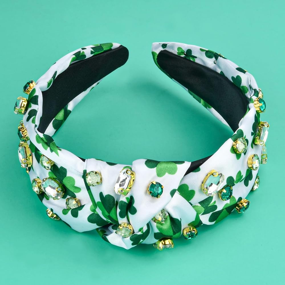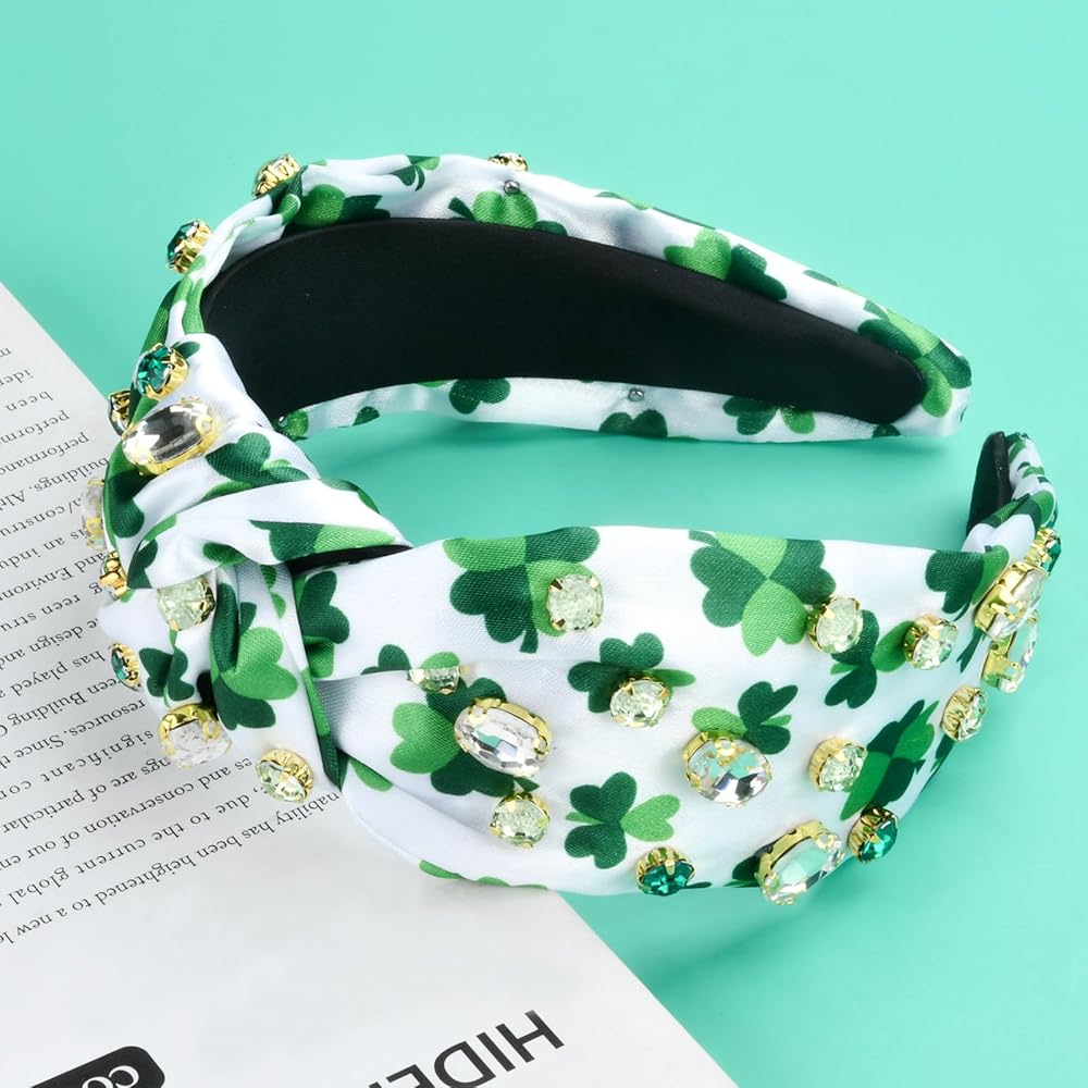 St.Patrick's Day Headbands for Women Rhinestone Beaded Top Knot Headband Green Shamrock Crystal Wide Lucky Leaf Knotted Headband St Patricks Day Hair Accessories Gifts (Shamrock-A)
