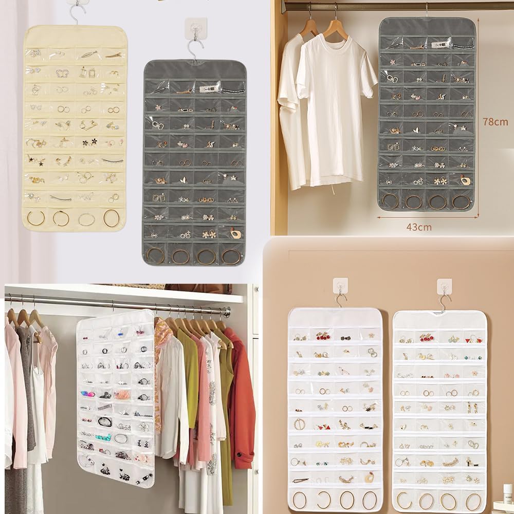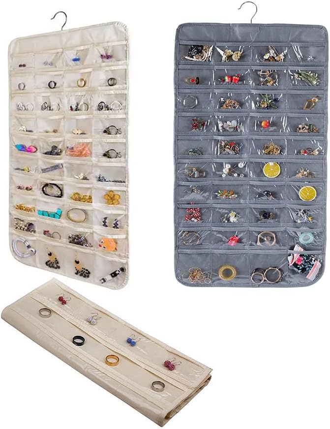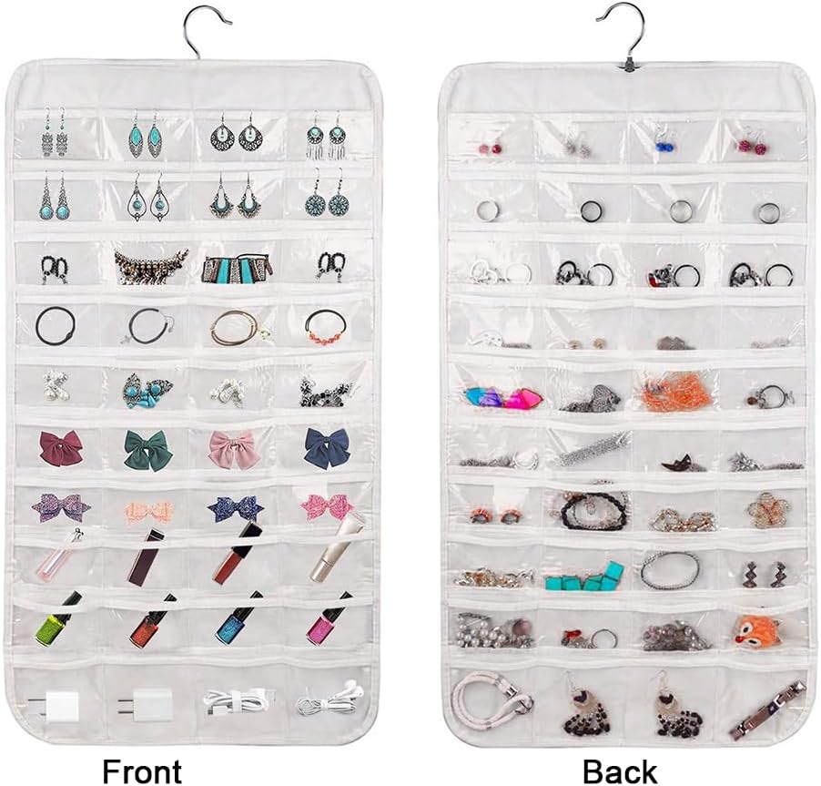 【Double sides organiser】 Double sides accessories organizer holder, totally up to 80 pockets to store necklaces, rings, earrings, bracelets, hair accessories, nail polish, lipstick, and more.