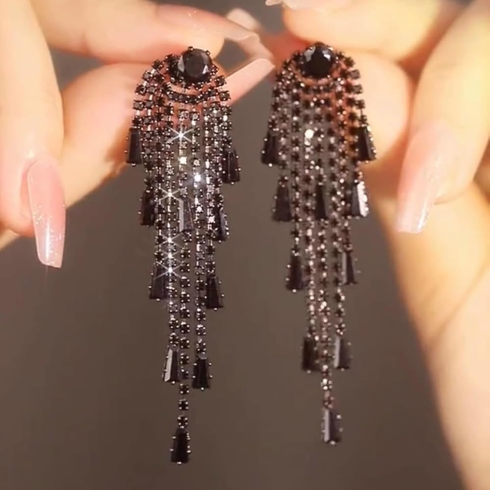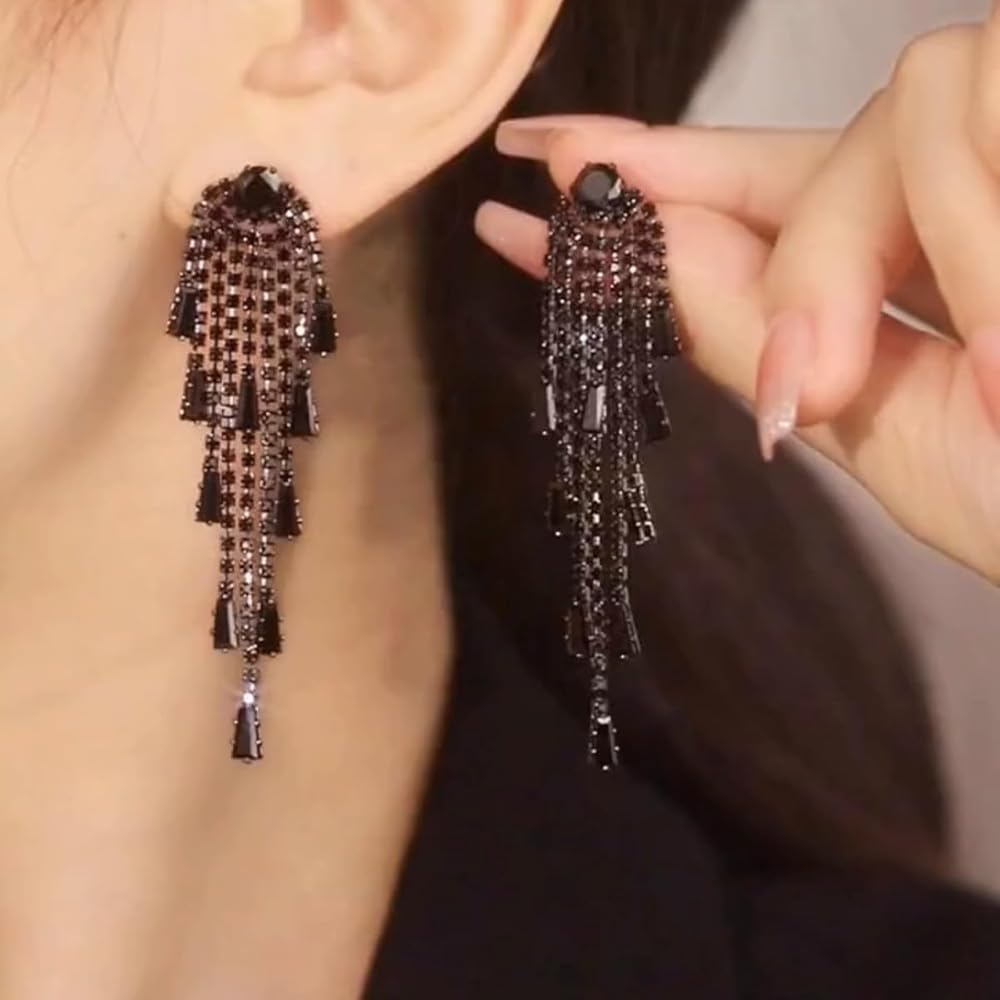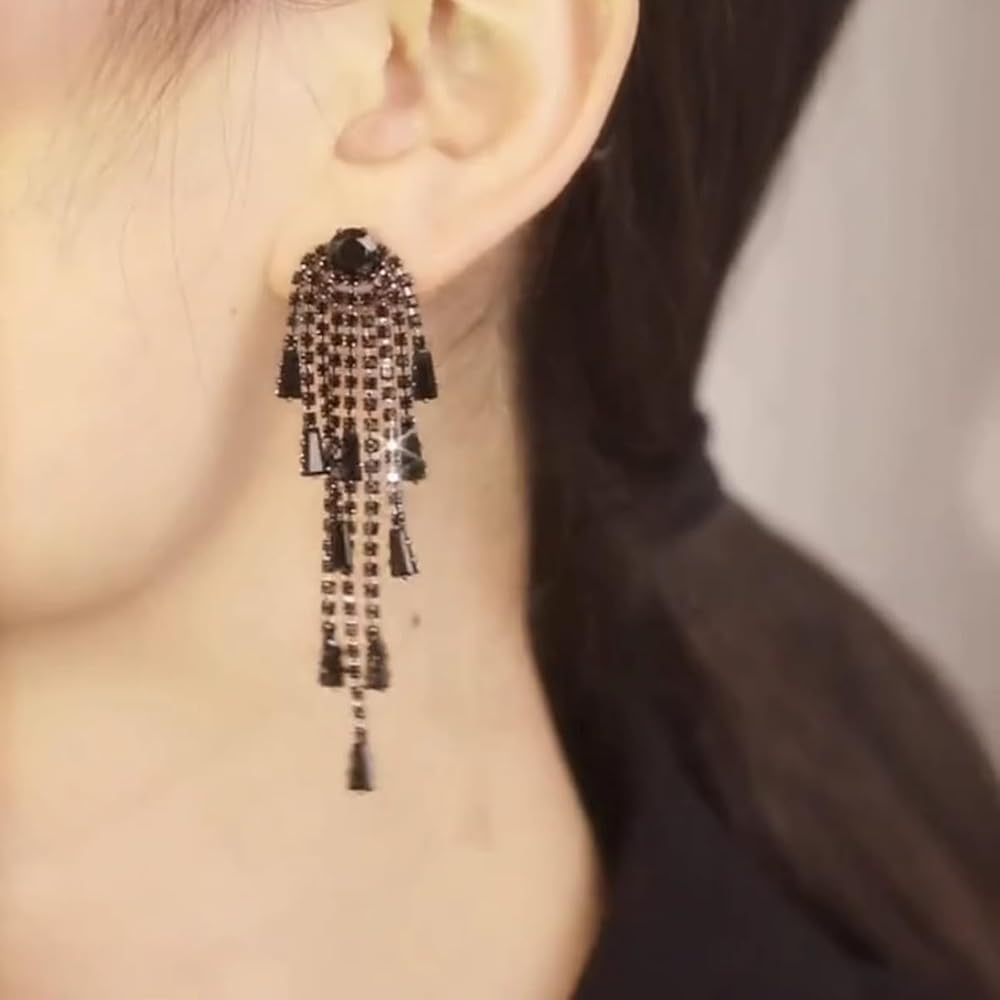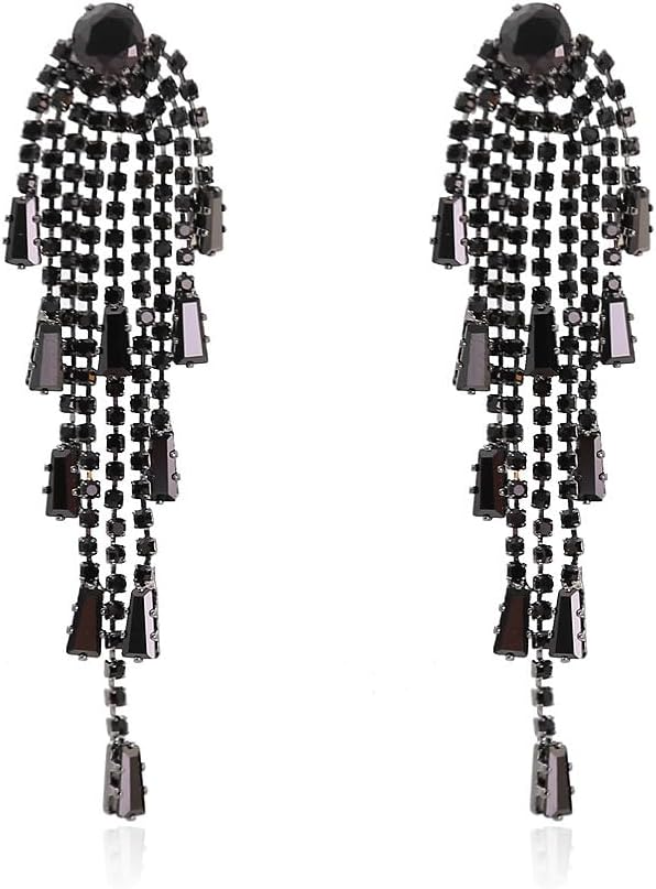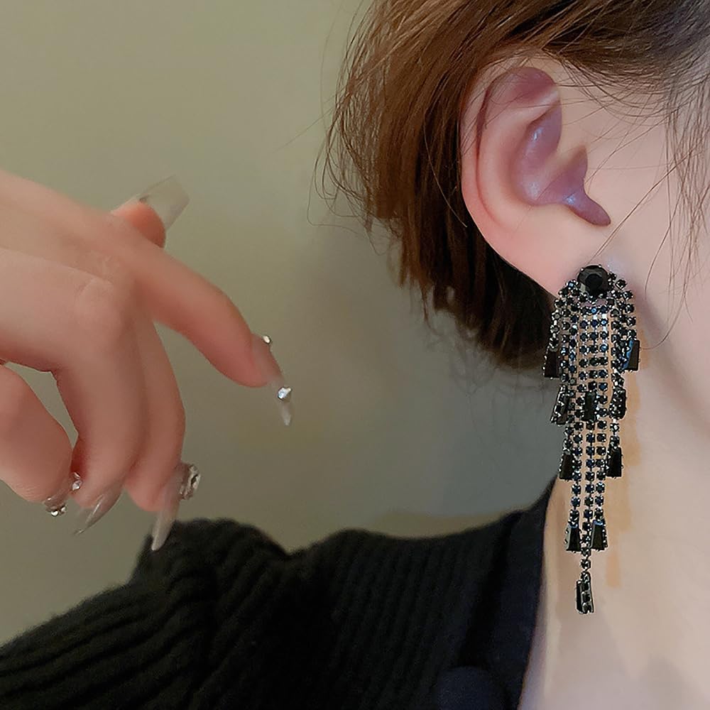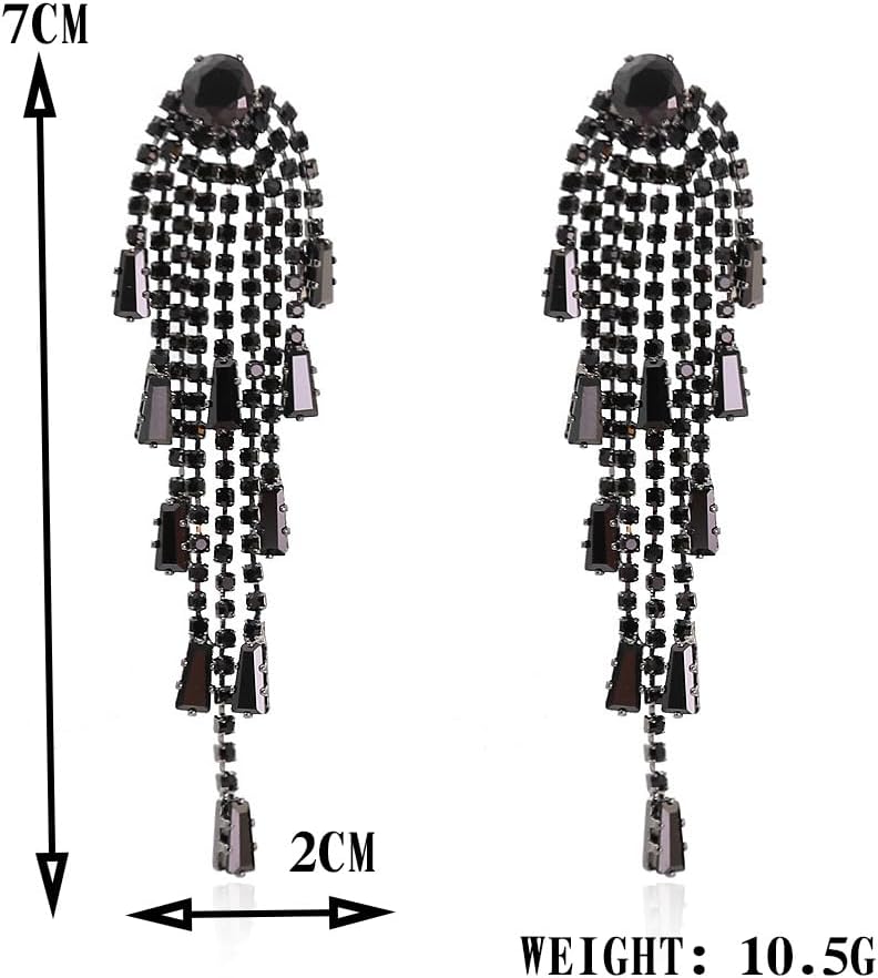 Black Rhinestone Long Tassel Earrings for Women.Crystal Chandelier Dangling Earrings Black Statement Earrings Fringe Zircon Drop Earrings Fashion Jewelry Gifts