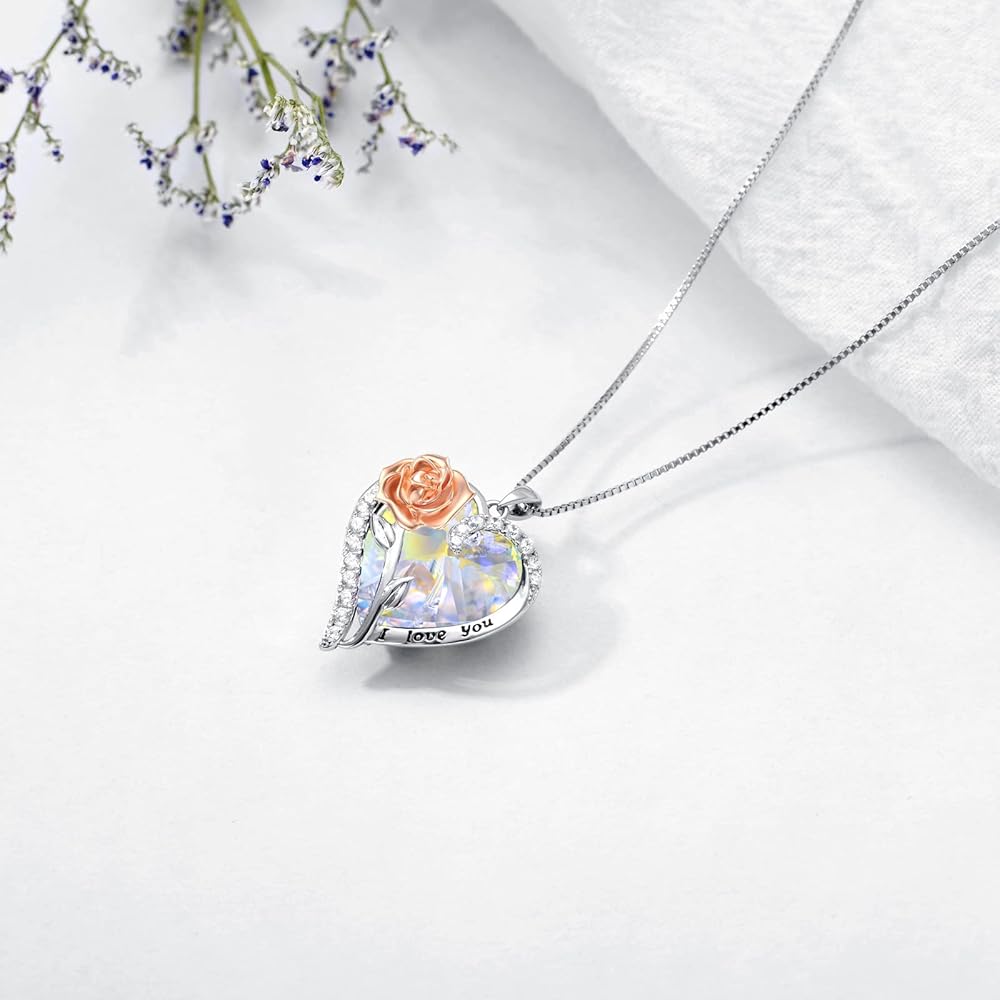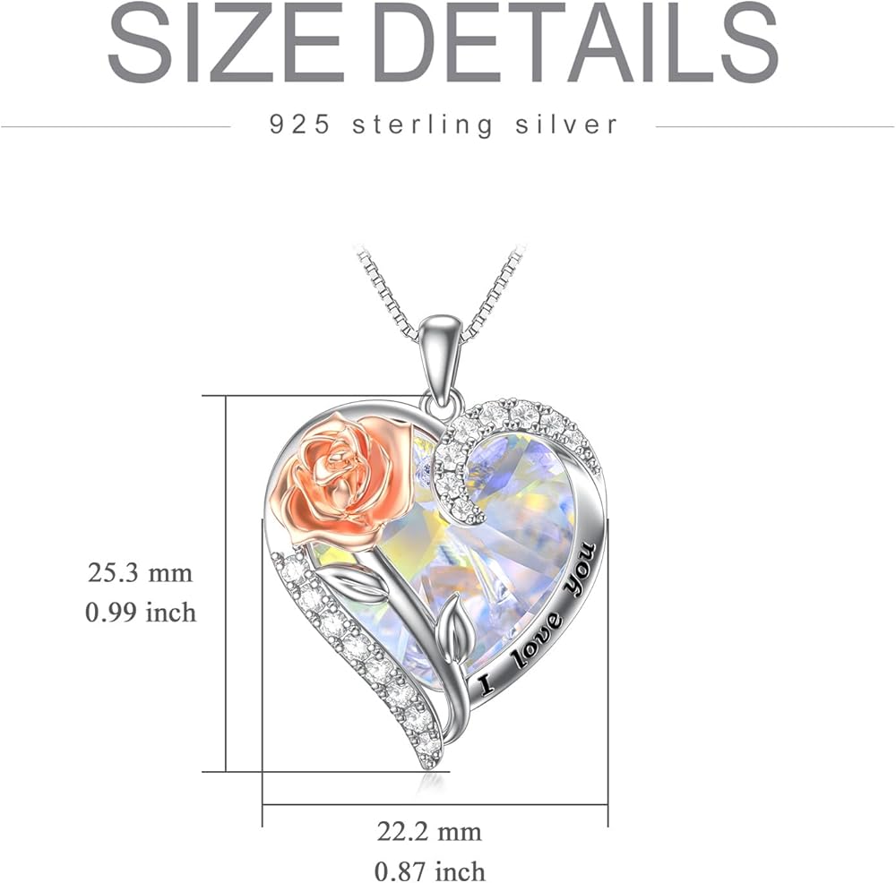 TOUPOP Birthstone Necklace for Women 925 Sterling Silver Rose Flower Heart Crystal Pendant Necklaces I Love You Jewelry Birthday Christmas Gifts for Women Her Girlfriend