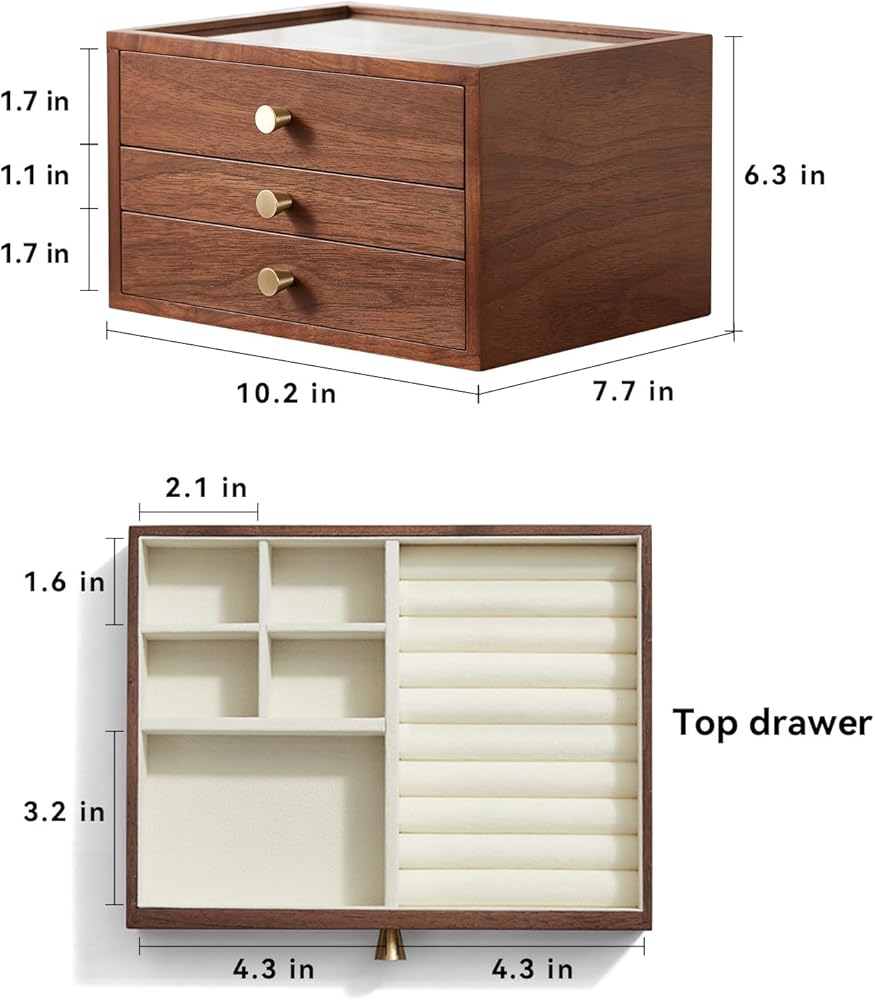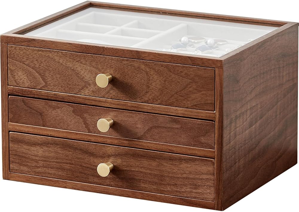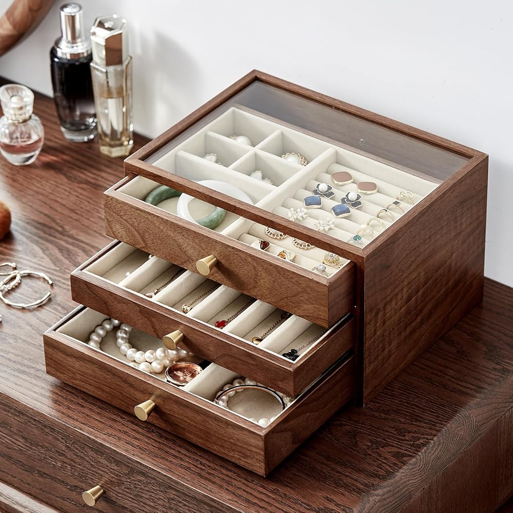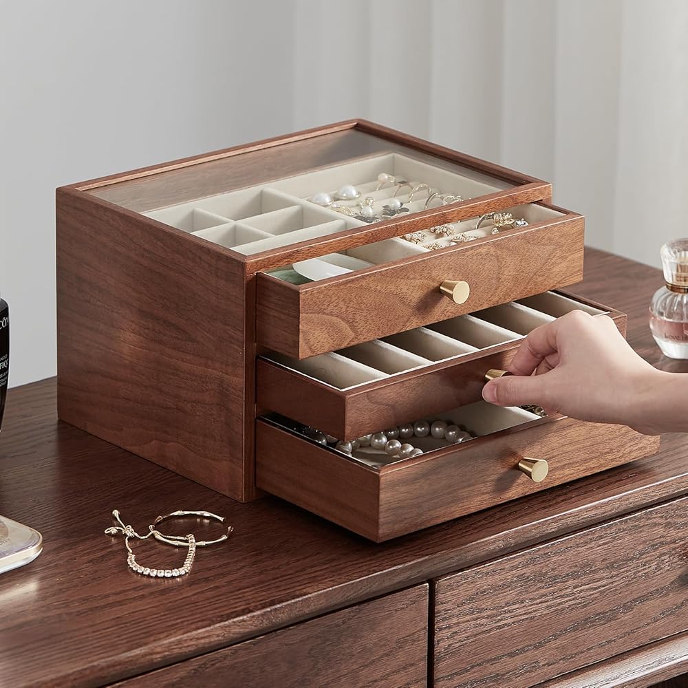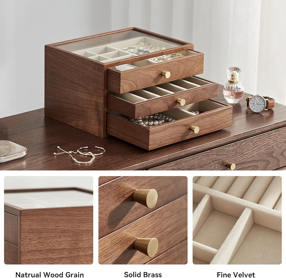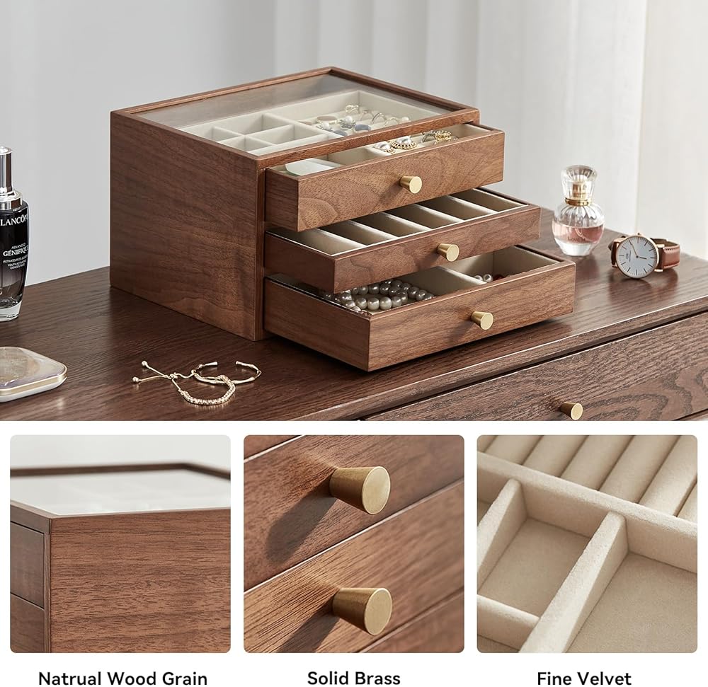 Have you ever lost jewelry? —— This women's jewelry box would be an excellent gift for yourself. The unique design of Homruilink jewelry box not only enhances your storage space, but also the rustic quality of walnut wood to complement your unique taste.