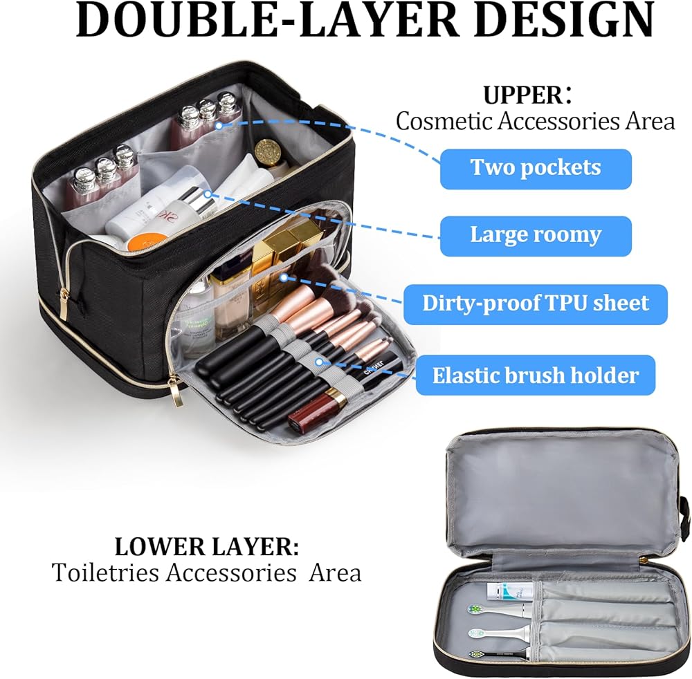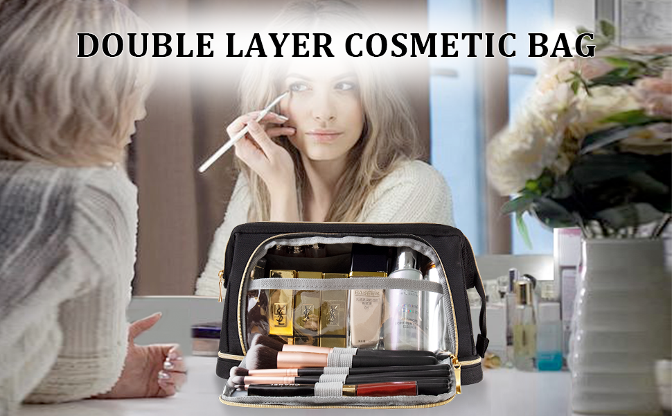 Large Nylon Makeup Bag,Double Layer Large Capacity Cosmetic Bag,Wide-open Travel Make Up Bag Portable Preppy Cosmetics Brushes Organizer Bag Toiletry Travel Bag for Business Trip,Office(Black)