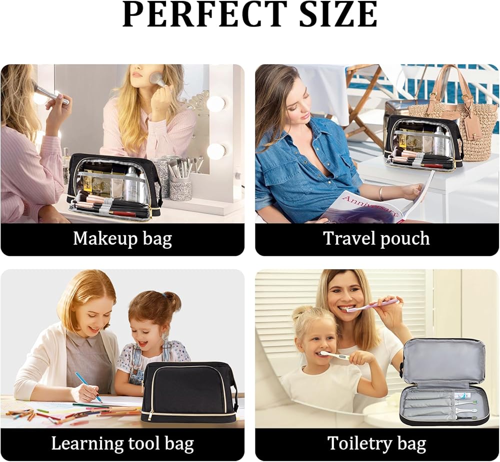 ✨【DUAL-LAYER DESIGN】- The product is divided into upper and lower storage areas,The upper layer has a large opening for easy access,an independent brush holder and two small pockets for lipstick, earrings, brushes etc., without mixing.The bottom is a toiletries accessories area, putting toothbrush, toothpaste, razor;