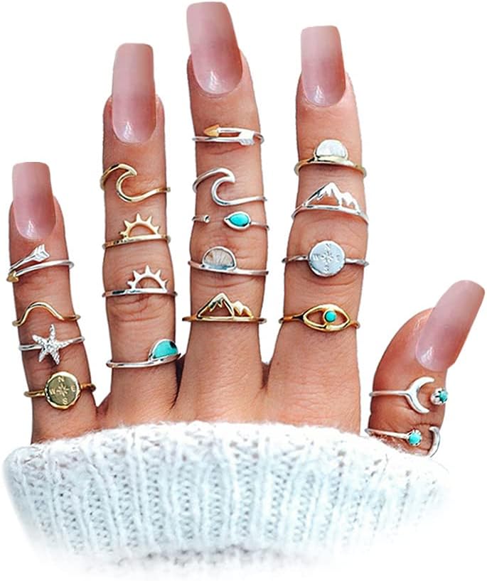 Boho Ring Set:The 19 PCS Knuckle rings are made alloy, One order you can get 19 knuckle rings,We have wave rings,rhinestone ring,turquoise rings,starfish ring, peak ring,arrow ring,moon ring,sea ring,compass ring,vintage rings,etc.You can wear different rings every day according to your mood.