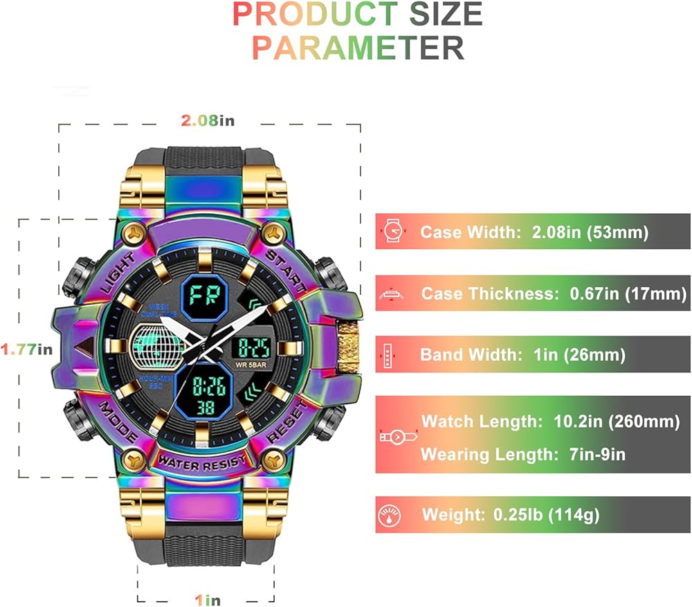 DUAL DIAL TWO TIMEZONE: Analog and digital dual dial support two different timezone. Shock resistant, stop watch, military 12H/24H time, and LED back light functions make it perfect for all kind of sport and daily use.