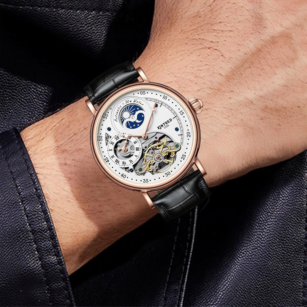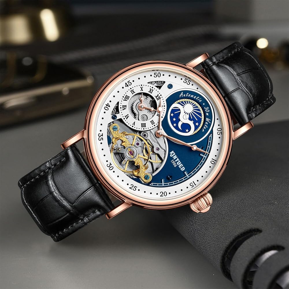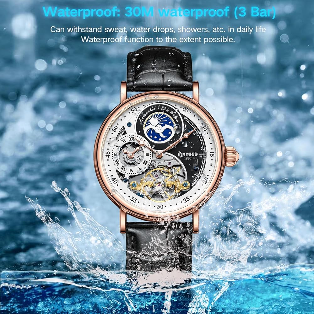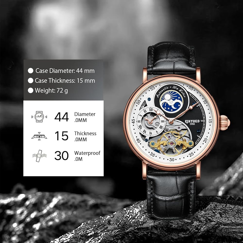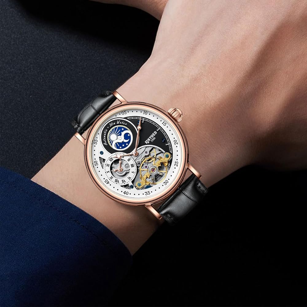 IK COLOURING Mens Luxury Skeleton Automatic Mechanical Wrist Watches Leather Moon Phrase Luminous Hands Self-Wind Watch,Tourbillon Automatic Waterproof Wrist Watch for Men Gift