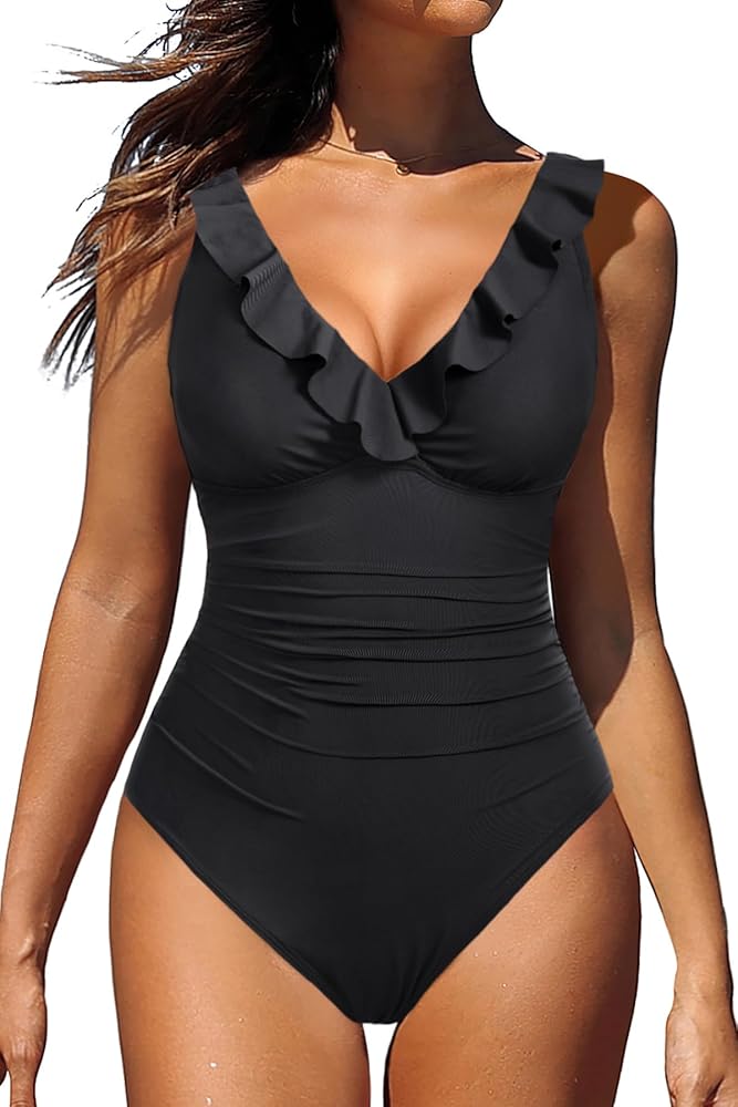 Ruffled One Piece Bathing Suit:This one-piece bathing suit features a plunge V-neckline, falbala shoulder, and flounce at the front, making it both cute and fashionable while still being modest. The design is perfect for those who want to look stylish while still maintaining a level of modesty.