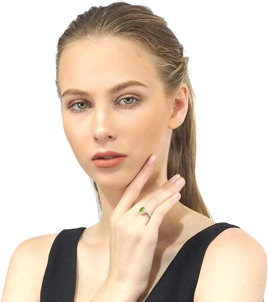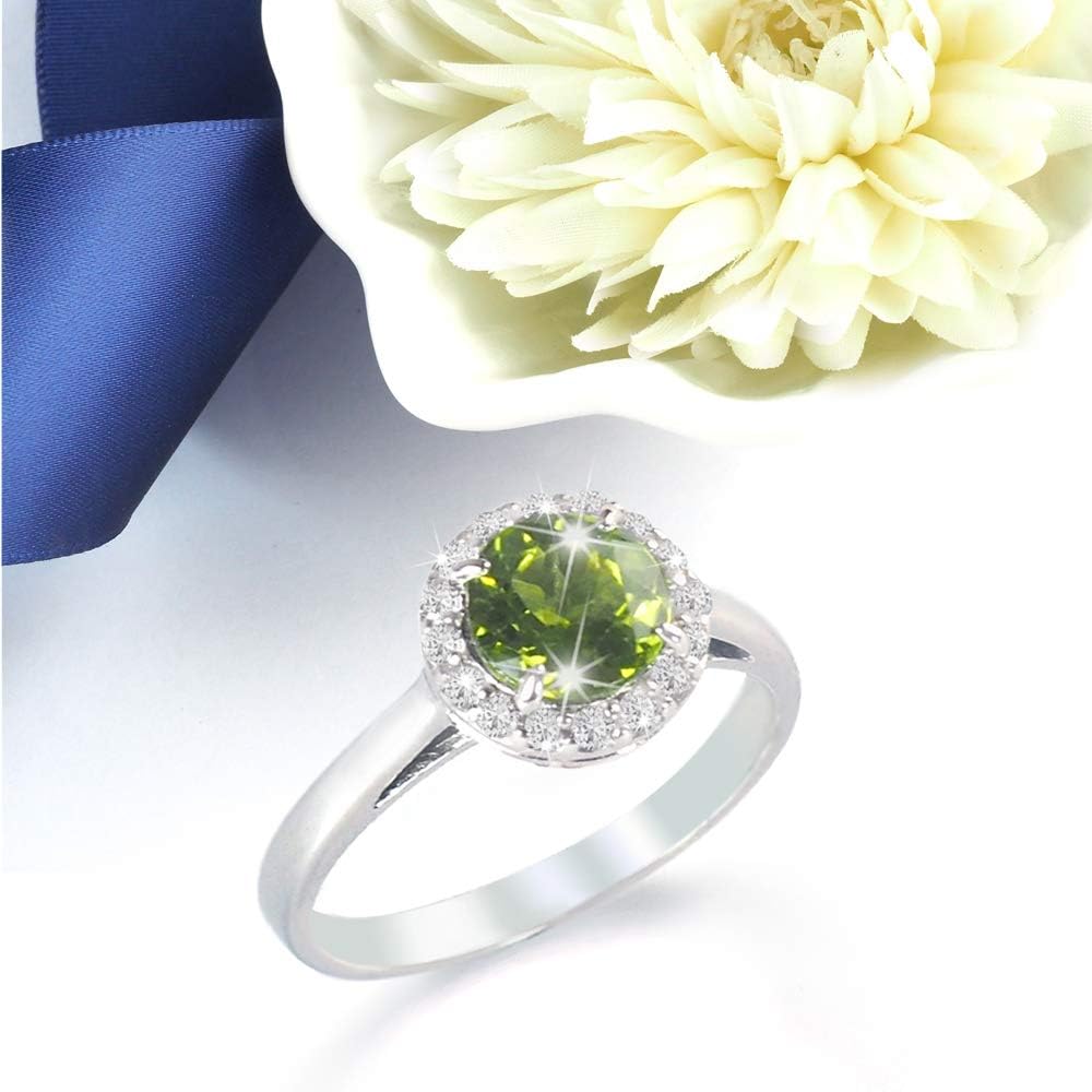 Round center gemstone featuring halo white topaz sparkly stones; colorful large accent prong setting stone; real solid authentic 925 rhodium plated sterling silver for high shine and polish; elegant and sophistic promise ring