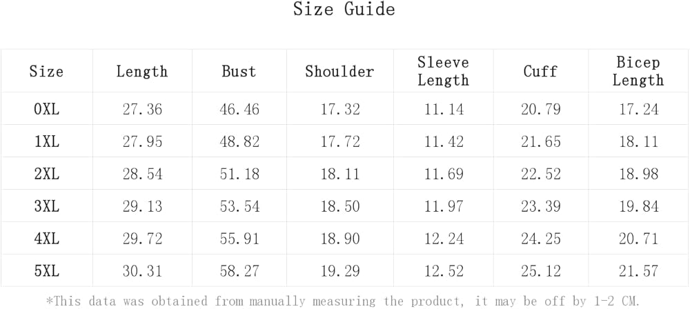 5X-Large Plus: Bicep Length: 21.6", Bust: 58.3", Cuff: 25.1", Length: 30.3", Shoulder: 19.3", Sleeve Length: 12.5"