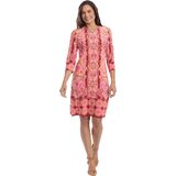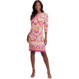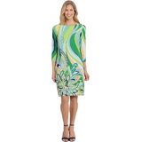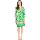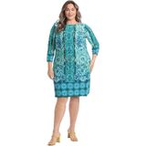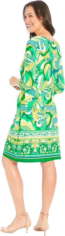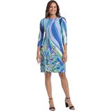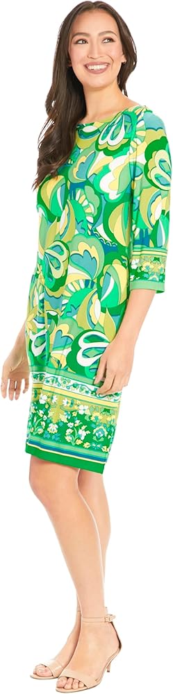Boat neck, 3/4 sleeves, and an above the knee length skirt.
