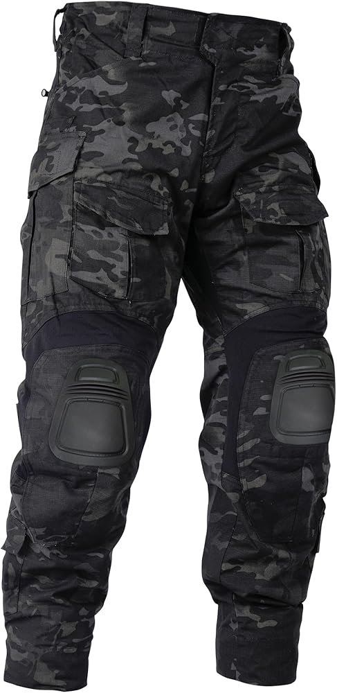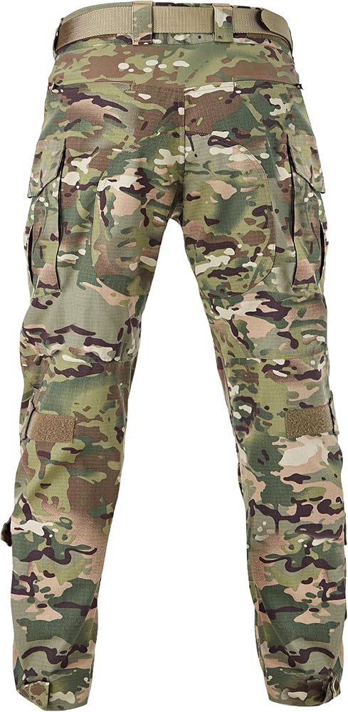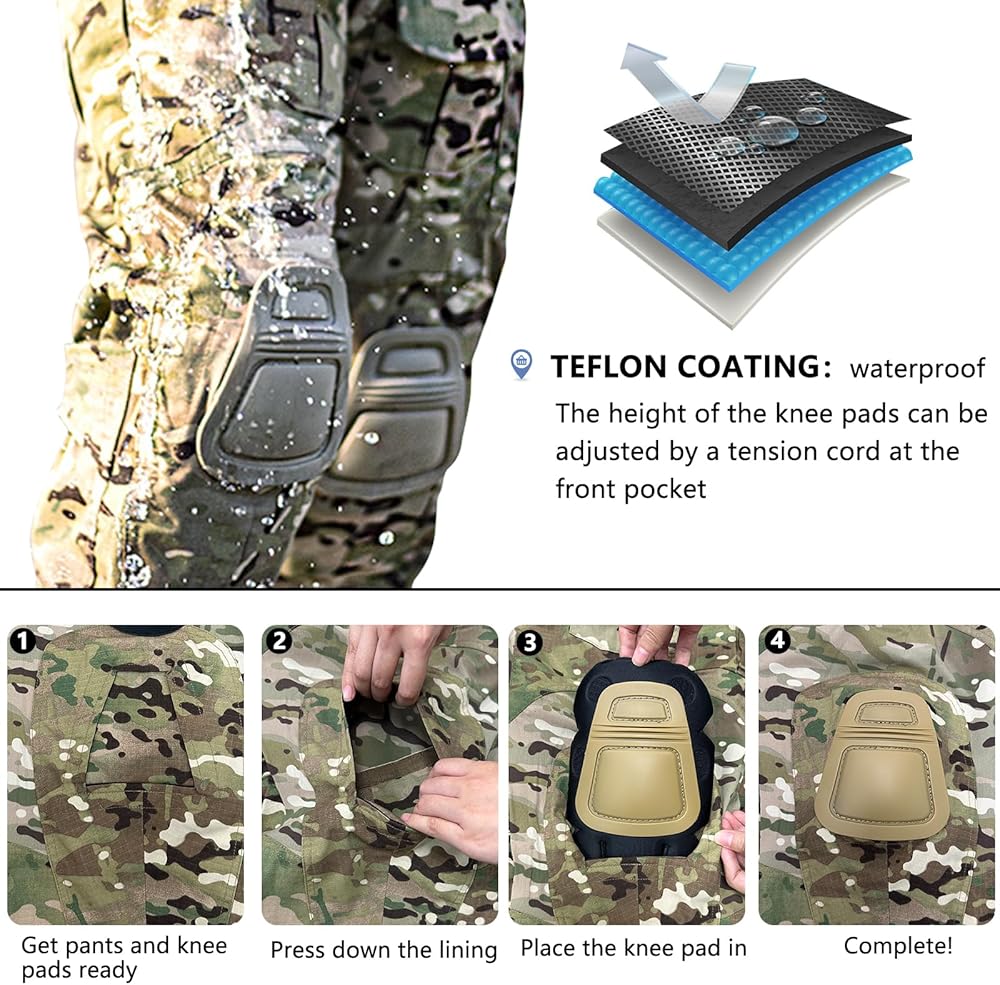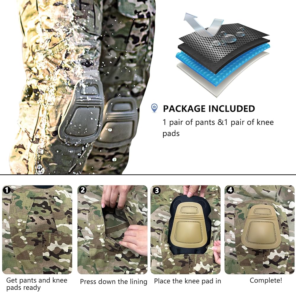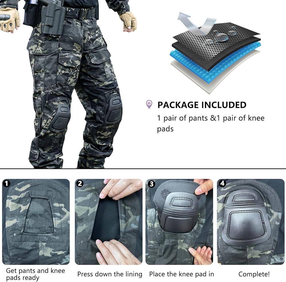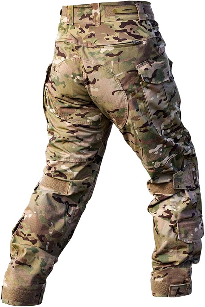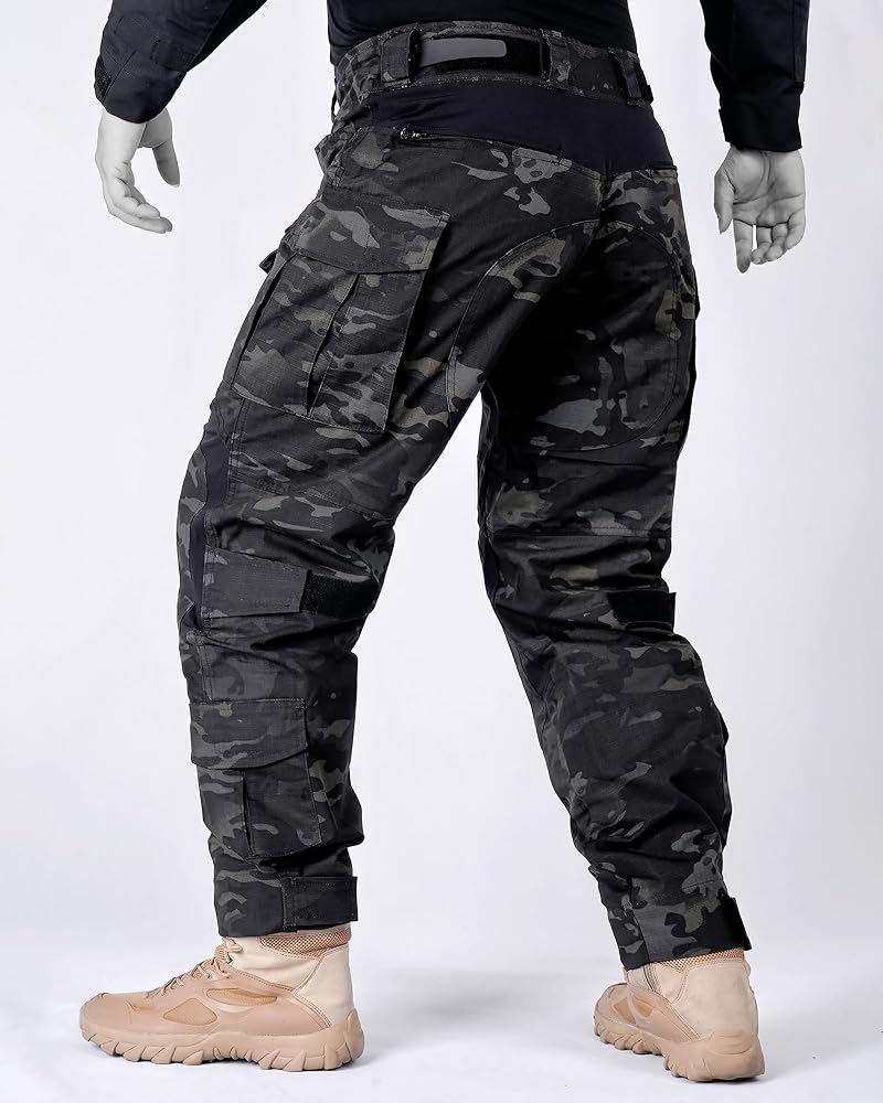 Multi pocket cargo pants for men: The camo pants men are with 10 pockets for tactical tools and self items. Including 2 front slant pockets; 2 thigh pockets; 2 side leg pockets; 2 side calf pockets; 2 zipper rear pockets.There are three hook and loop panels sewn onto the knee pad pockets top and sides which attach to the hook and loop material inside to pant legs which drastically helps prevent the knee pad blowing out