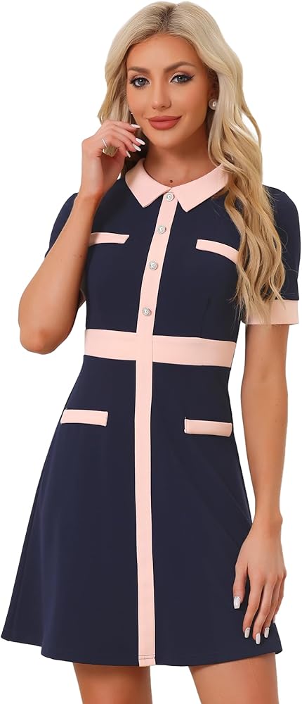 - Point Collared, Short Sleeves, Faux Pockets, Strechy Fabric, Aline Dress