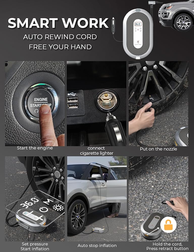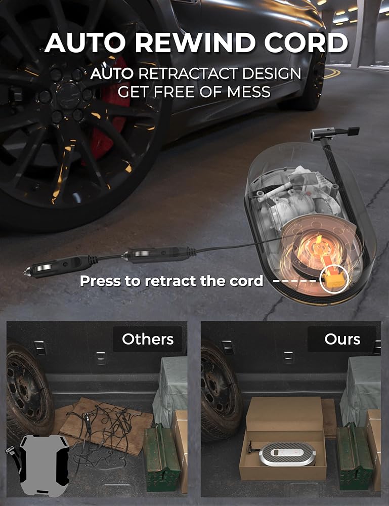 [EXCLUSIVE RETRACTABLE POWER CORD] Say farewell to tangled cables and messy storage with our tire inflator's auto-retractable cable. Press the tangelo button, the power cord will retract automatically, keep it tidy and save you time.