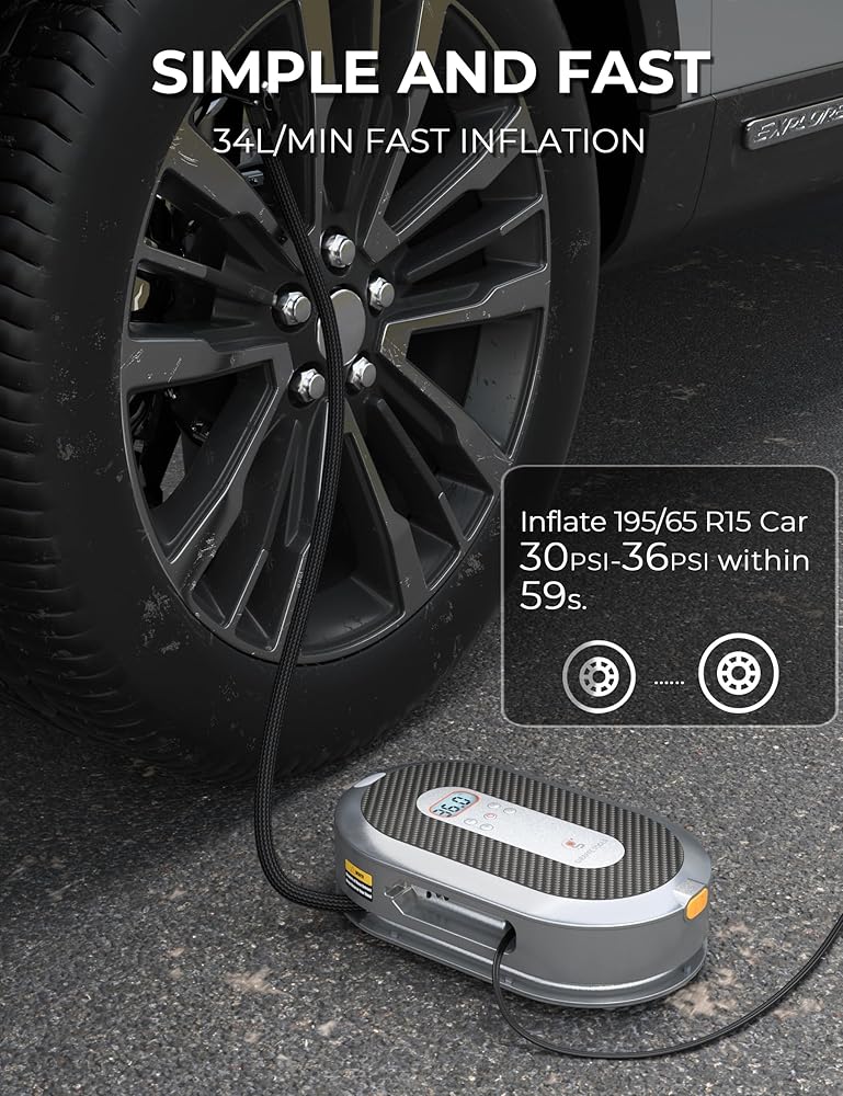 [STRONG MOTOR & CABLE] This 12V portable tire inflator has a high-quality motor, can inflate your car tires from 0-35psi in 5 minutes, provides a maximum pressure of 150 PSI and airflow of 34L/Min, getting you back on the road in no time. LED light allows the inflating to work at dark nights. 5-10 minutes of continuous inflate, please let the air compressor rest and cool for a while.