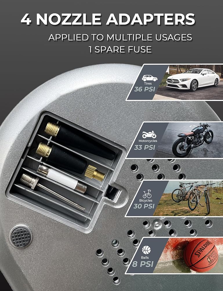[READY TO USE] This 12V air compressor for car with a 13ft cigarette lighter cord, which is suitable for almost all cars. Additional 4 nozzle and fuse, can be stored in the pump slot, ready to switch usage scenarios. Please note: Not suitable for heavy-duty trucks, and please use a converter to use in a wall plug.