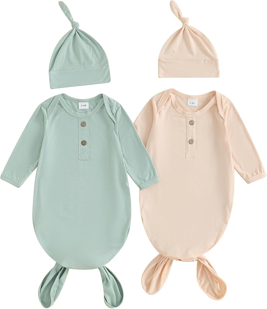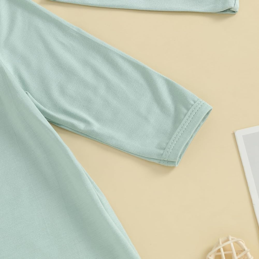 Feature: These newborn gowns for girls boys, long sleeve gown rompers in different sweet candy colors, easy diaper change, no button, zipper, or messy strings to deal with. These solid color baby boys girls knotted gown hat sets is cute and sweet for every babies