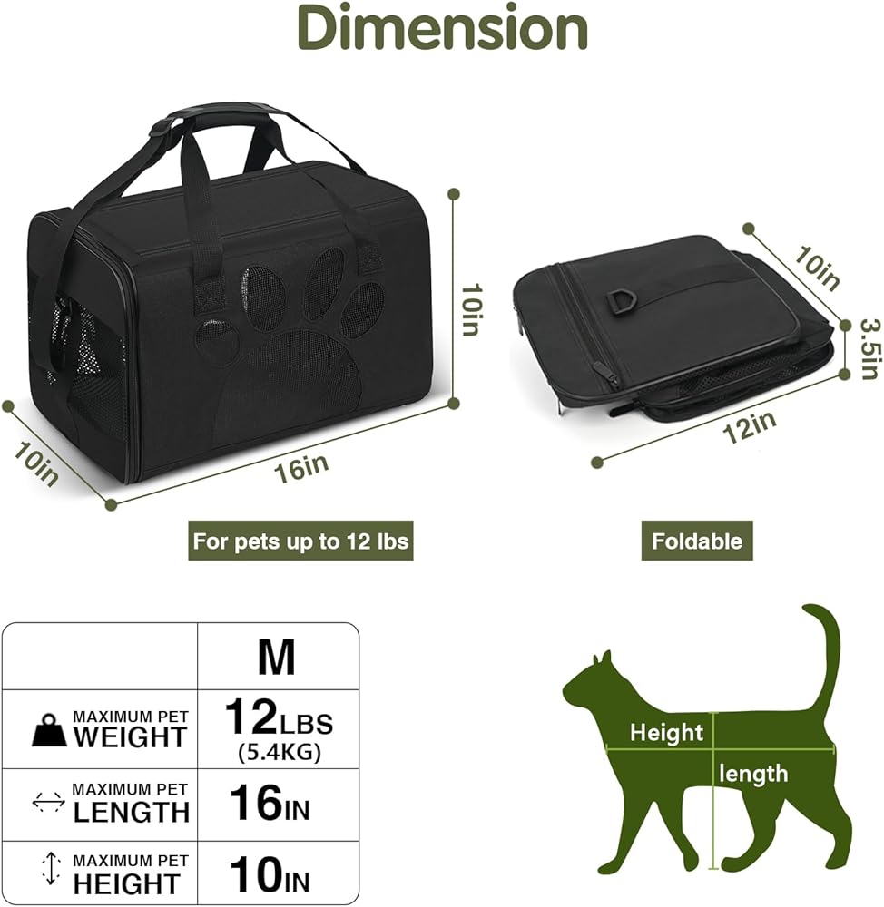 SIZE & WEIGHT: 16" x 10" x 10" (L x W x H). Suitable for max load of 12lbs pets. Please consider both your pet's weight, height and length when choosing the soft-sided carrier.