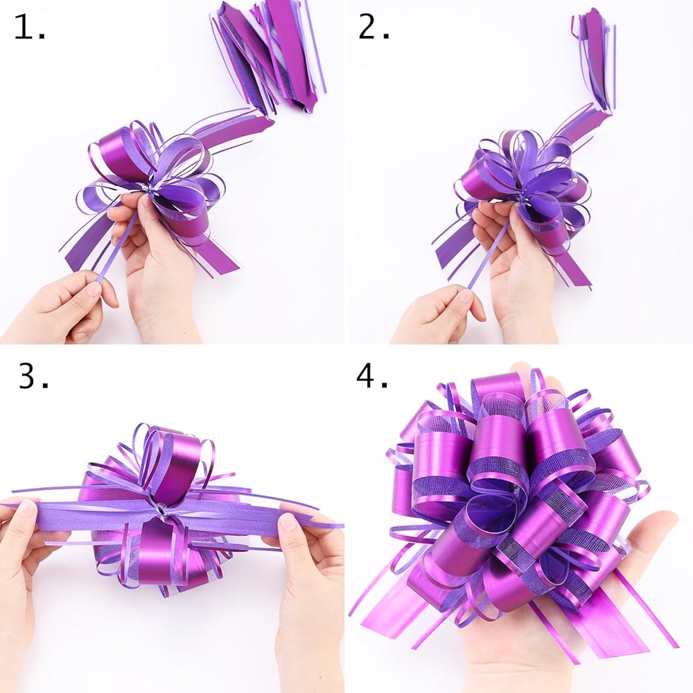 سهلة الاستخدام: يتكون كل قوس سحب من 8 قطع من أجزاء القوس الصغيرة التي يتم تثبيتها بإحكام بواسطة حلقات بلاستيكية. بعد فتح الأقواس، يمكنك العثور على شريطين رفيعين وسحبهما ببطء، ثم أخذ عقدة ثم الانتهاء من ربطة الشريط الجميلة. (يمكنك اتباع الخطوات الموجودة في صورة التجميع.)