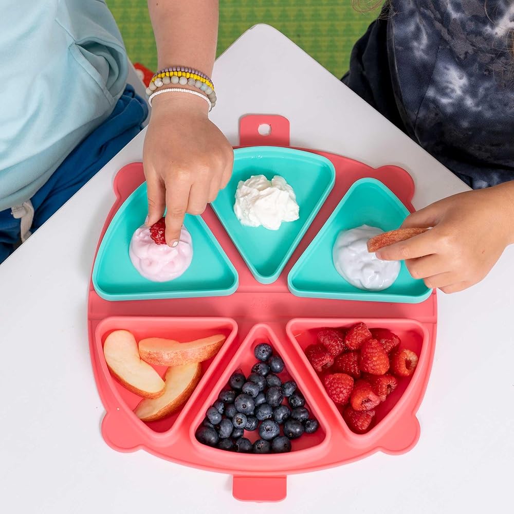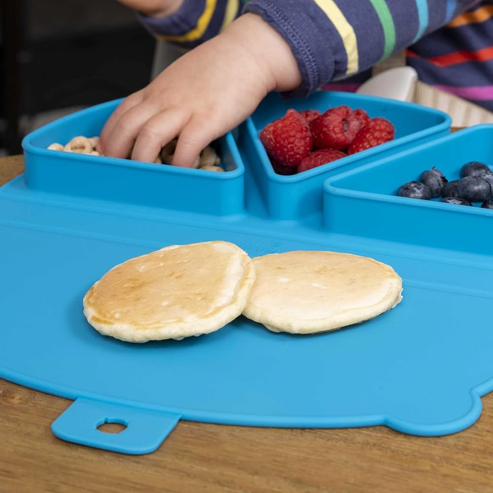 ✔️ EASY TO CLEAN: You'll get a set of 1 mat with 3 built-in reusable snack boxes and 3 lids, and caring customer support. Our snack containers are microwave, refrigerator and dishwasher safe and easy to clean. The mat is 10.6” x 10.5” and made of very durable and flexible silicone with an open mat area that doubles as a plate.