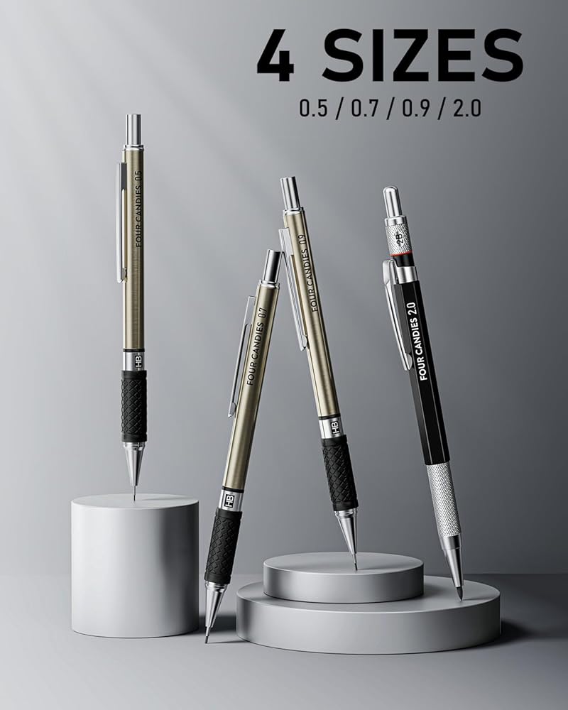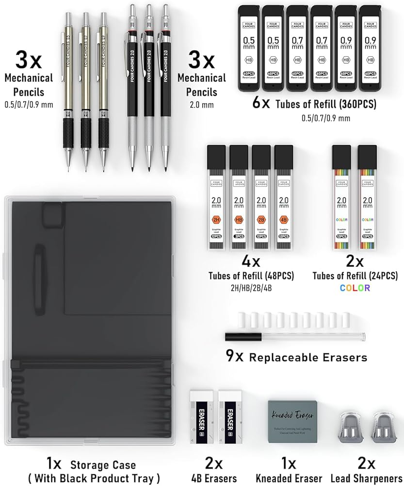 Four Candies 25PCS Art Mechanical Pencil Set with Case, 3PCS Metal Artist Lead Pencil 0.5, 0.7, 0.9 mm & 3PCS 2mm Holder (HB 2H 2B 4B Color) with 432PCS Graphite Lead Refills for Drawing Sketching