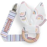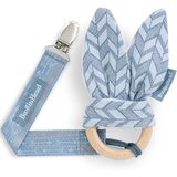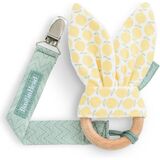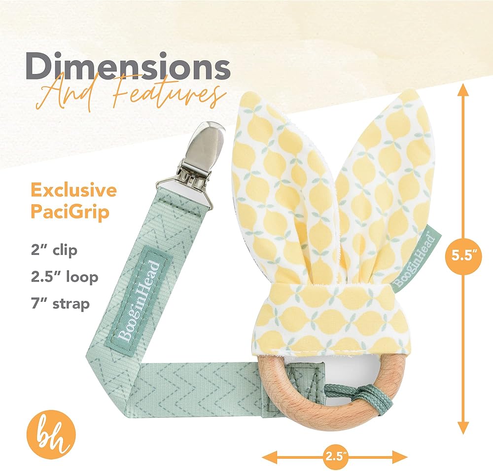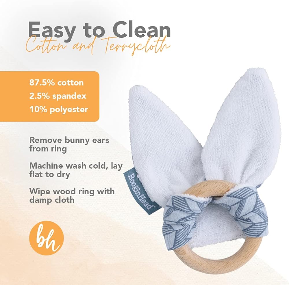 BooginHead BunBun baby teether with matching pacifier clip includes one beech wood and cotton fabric wooden teether and one pacifier holder for ages 3-36 months. The natural beech wood ring is untreated, buffed smooth, and won't splinter or chip.