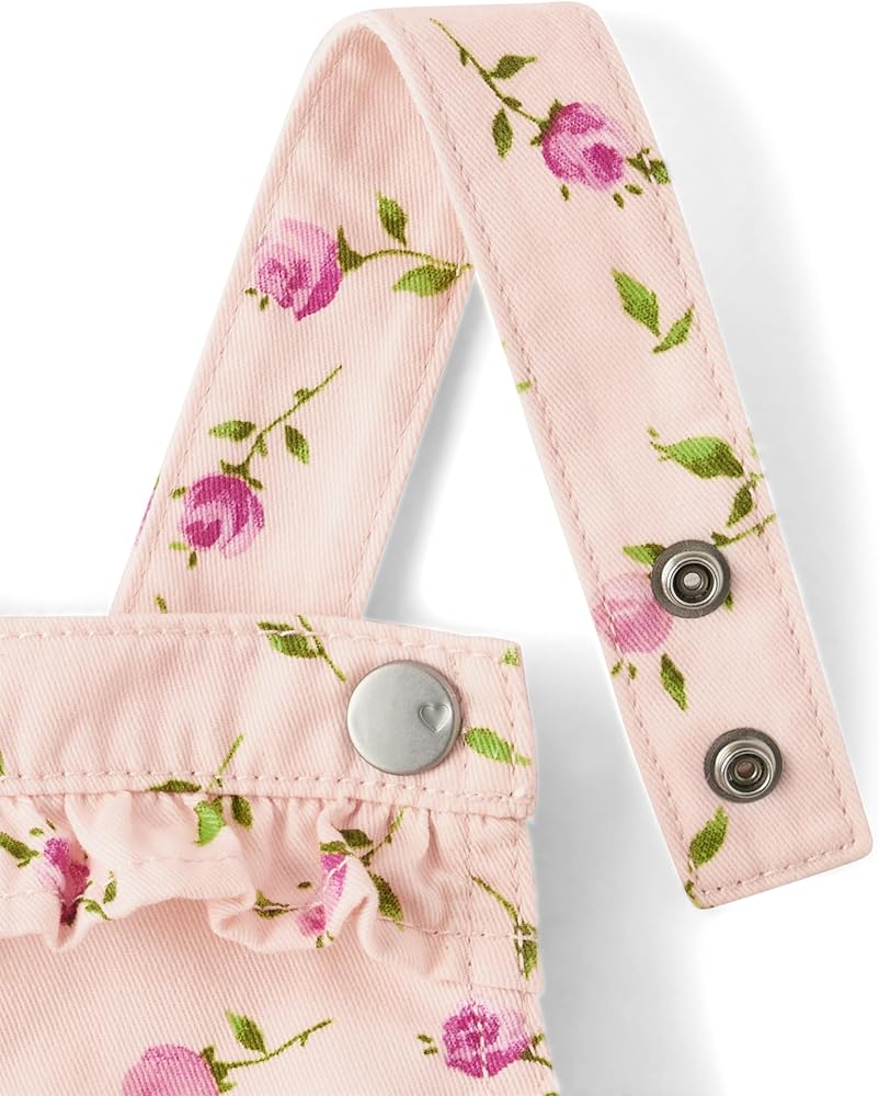 SKIRTALL— Features adjustable snap closures at shoulder straps, hidden snap closures at side, square neck with ruffle trim, front patch pockets, above-the-knee length and allover floral print