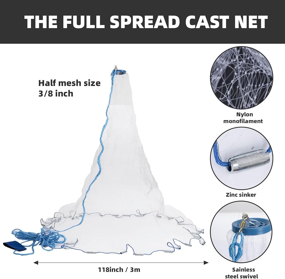 Handmade & Premium Material: handmade and it's made of quality materials such as steel, polyester, plastic and net, which makes it durable and long lasting, and the white net is designed to blend in with the water, making it less visible to fish and other marine life, thereby improving your chances of catching your targets