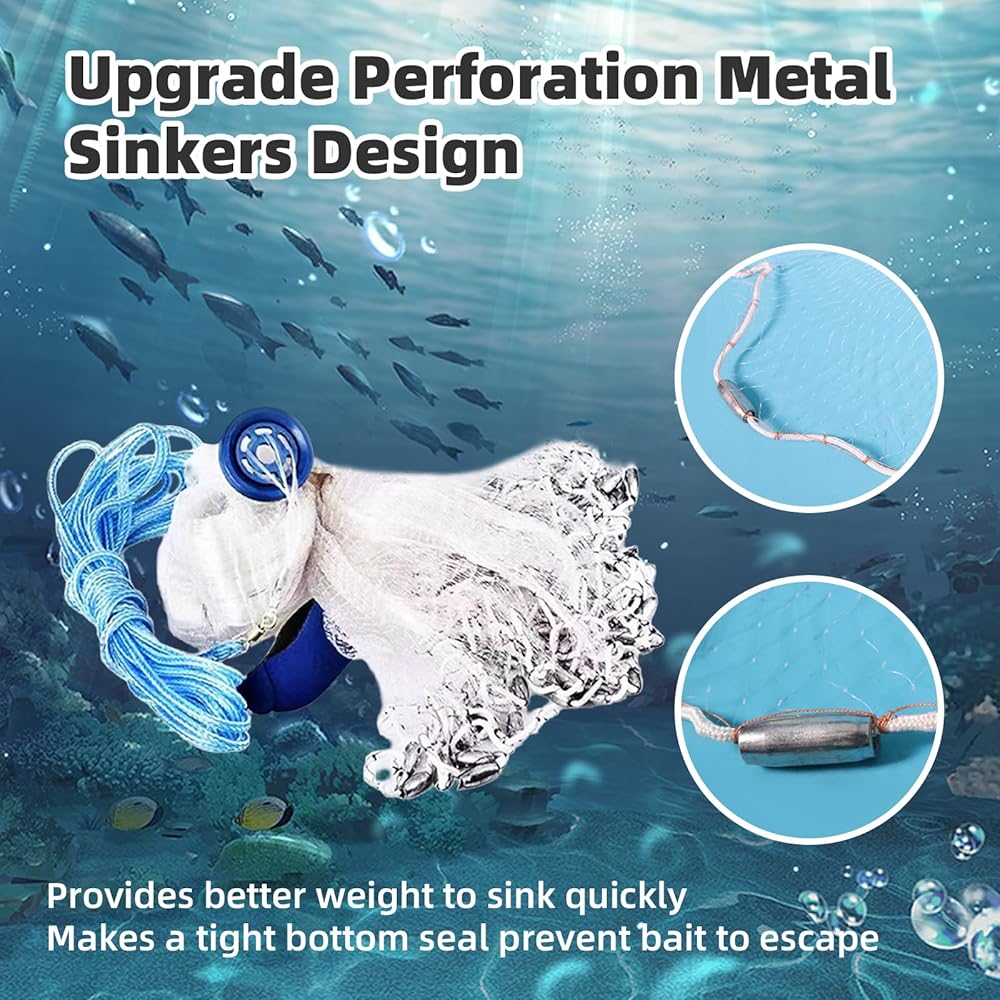 Upgraded material sinkers of fishing net: upgrade perforation metal sinkers design, the high density of steel sinkers can effectively reduce the splash water and provide better weight to sink quickly, making a tight bottom seal prevent bait to escape