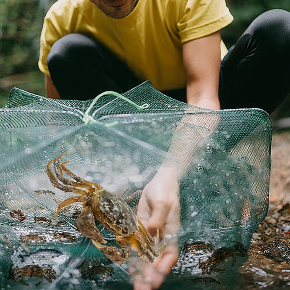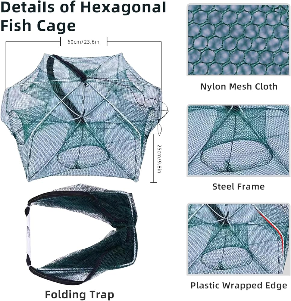 Package Includes: the package includes 2 different types of nets, 2 ropes and a float ring, the fishing net is paired with a thick rope, the hexagonal fish cage is paired with a thin but tough rope and a float ring, the ropes provide you with the needed anchoragecrab traps and fishing net,which make it easy for anglers to catch different types of fish, crabs, and even shrimp